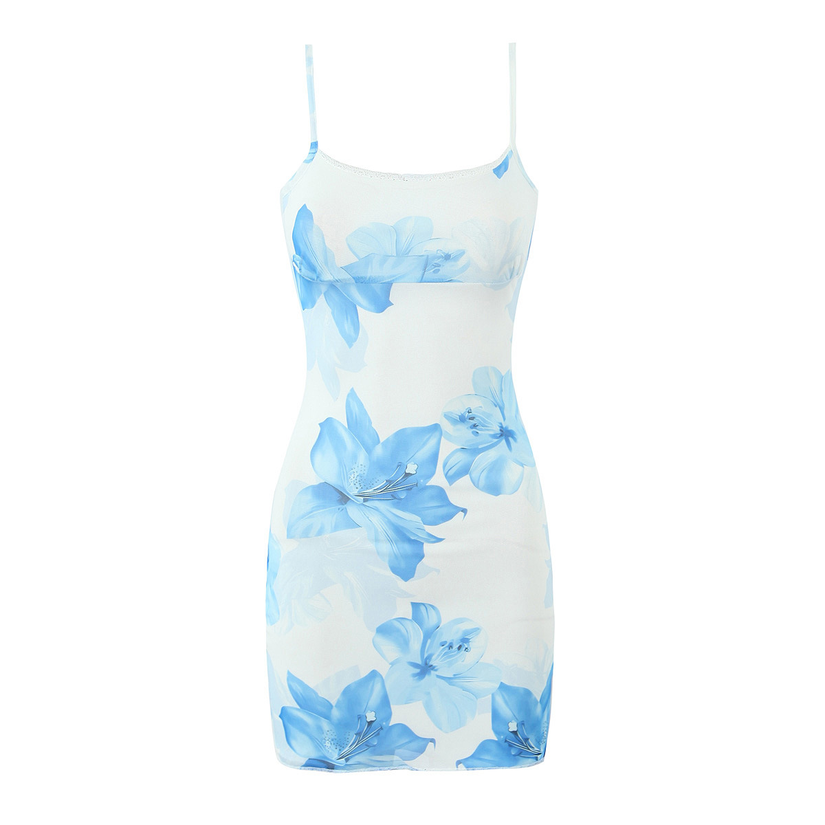 Retro Printed Mesh Suspender Dress Sexy Slim Fit Hot Girl Hip Mini Skirt