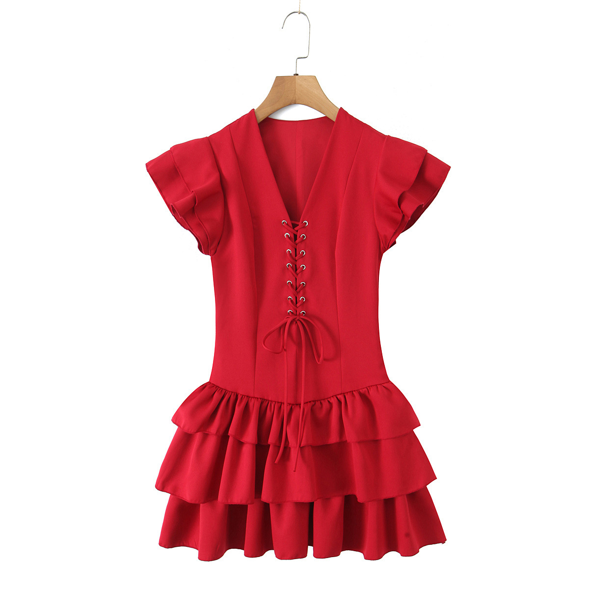 Small flying sleeves tie slim stitching solid color cake skirt short dress