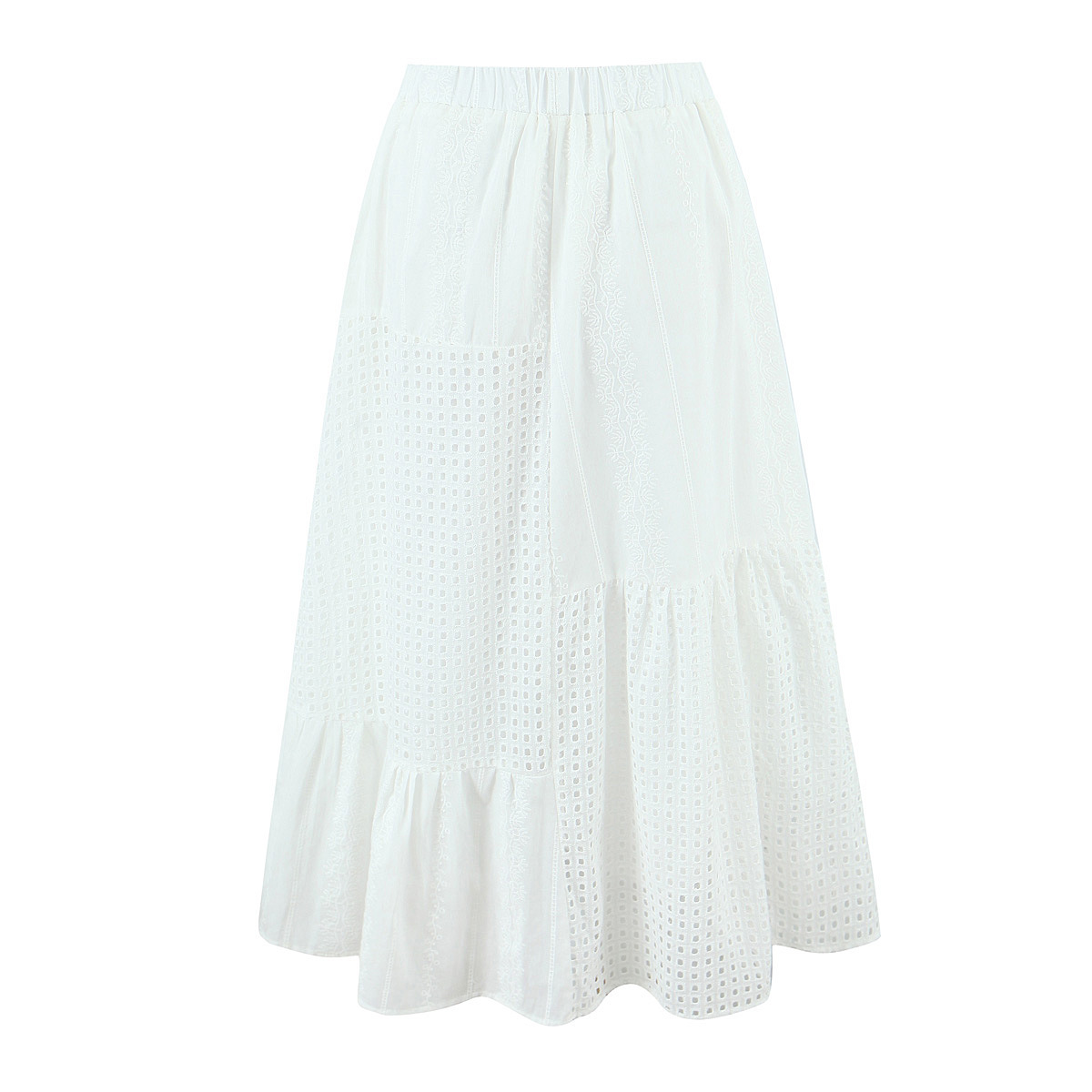 Retro style elegant temperament hollow hook flower elastic waist white long skirt