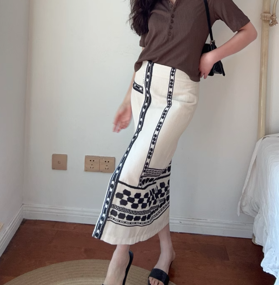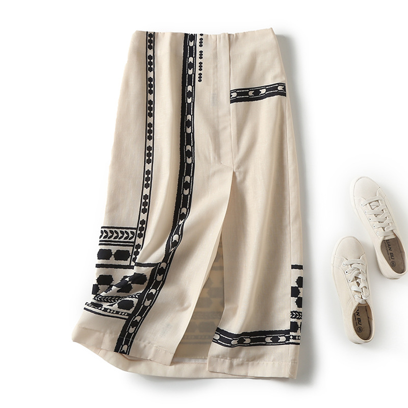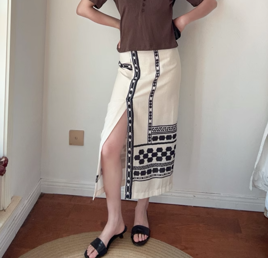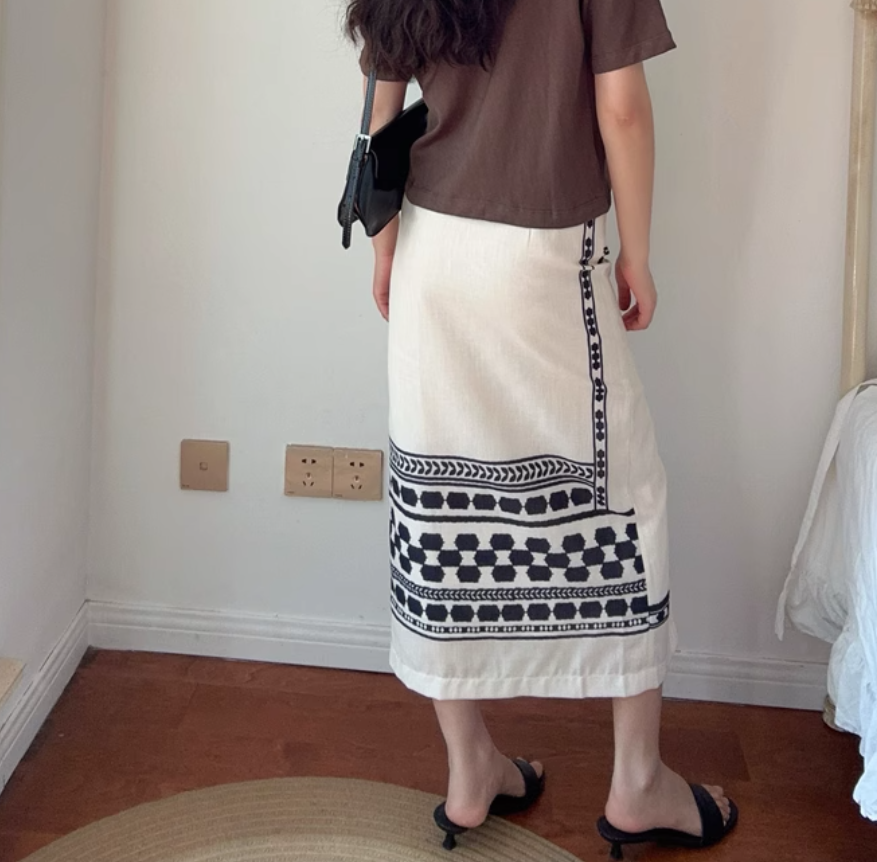 Bohemian ethnic style high waist front slit hip-wrapped midi skirt