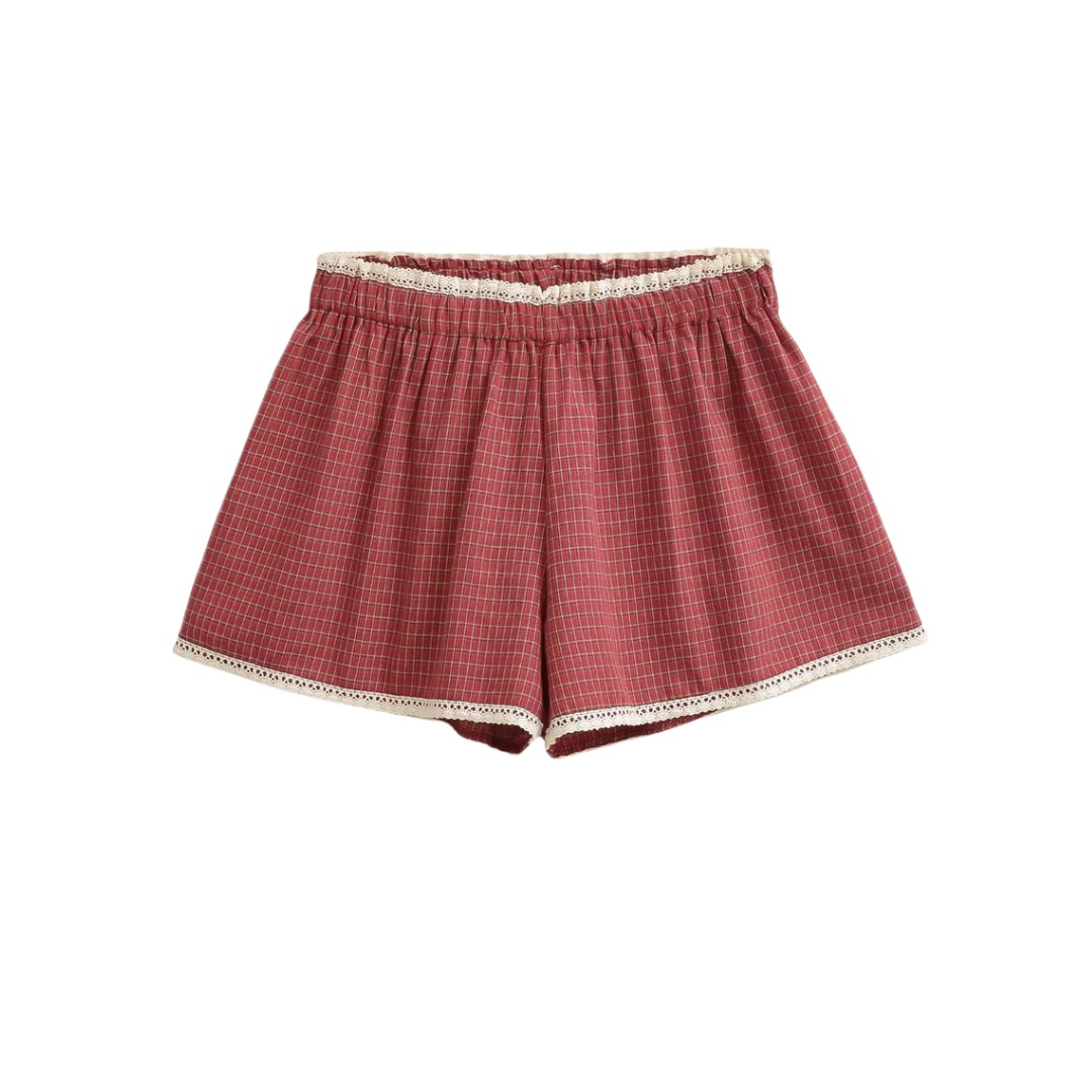 Wear elastic waist lace lace high waist plaid wide leg shorts