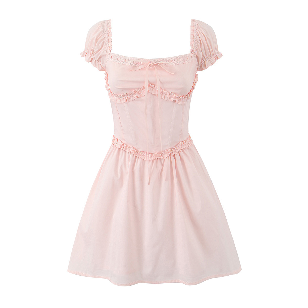 Sexy ruffled square neck bow puff sleeve dress with waist and back straps for girls