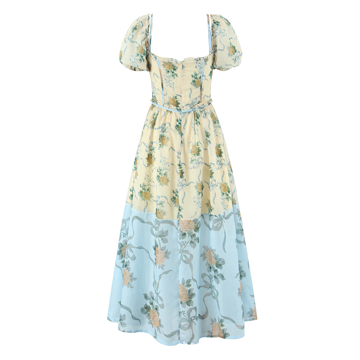 Bohemian retro romantic print patchwork puff sleeve waist slim dress