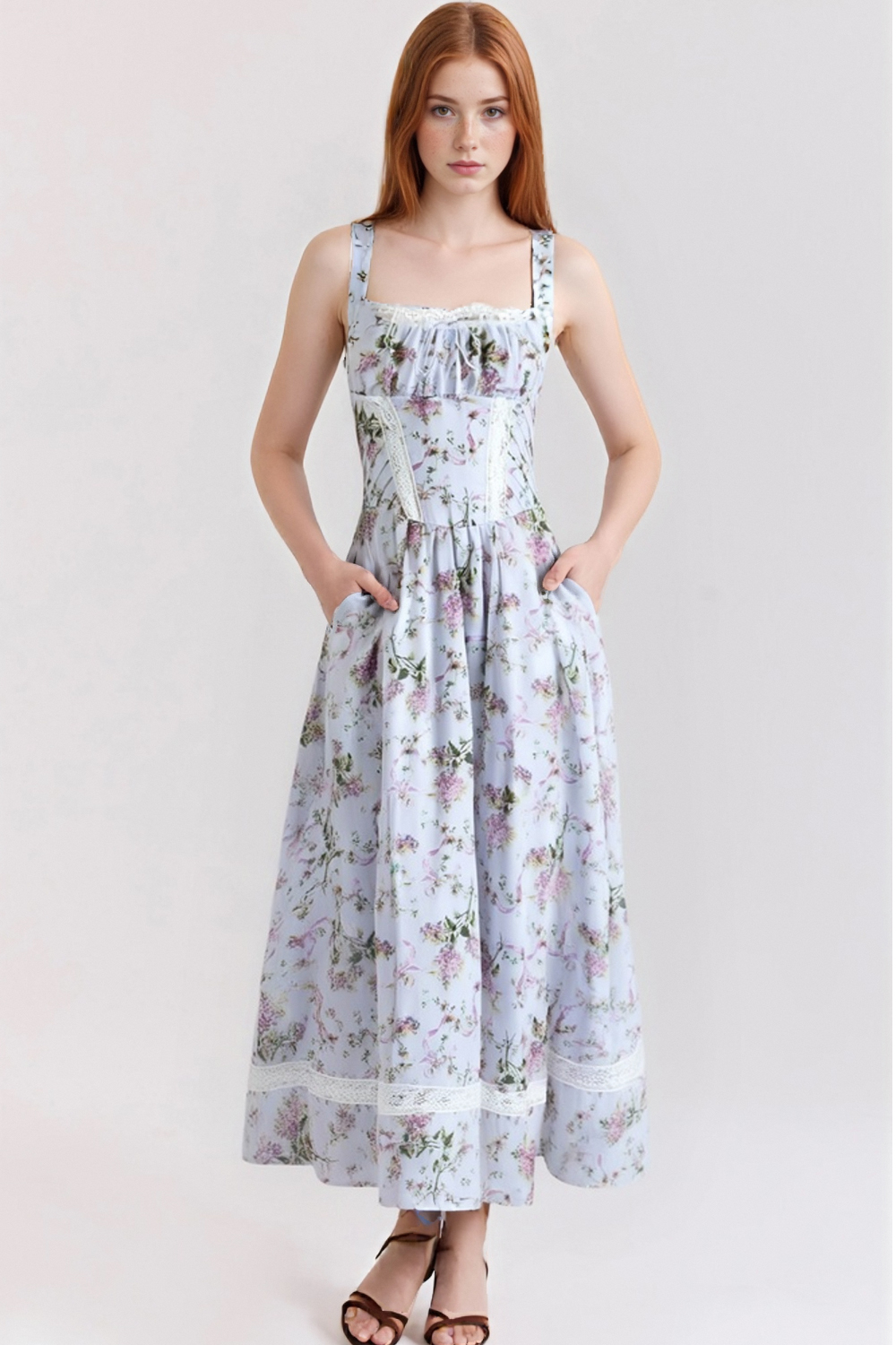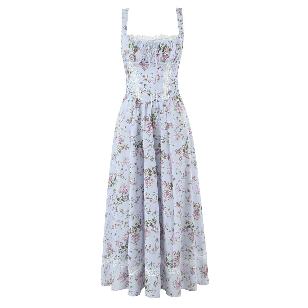 Romantic pastoral style lilac floral print lace patchwork waisted midi dress