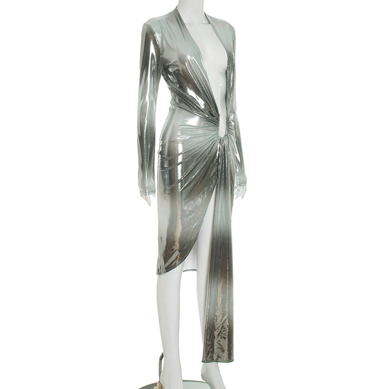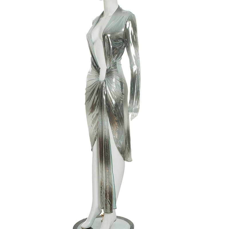 Trendy light-sensory design deep V-neck tight-fitting slit ribbon dress