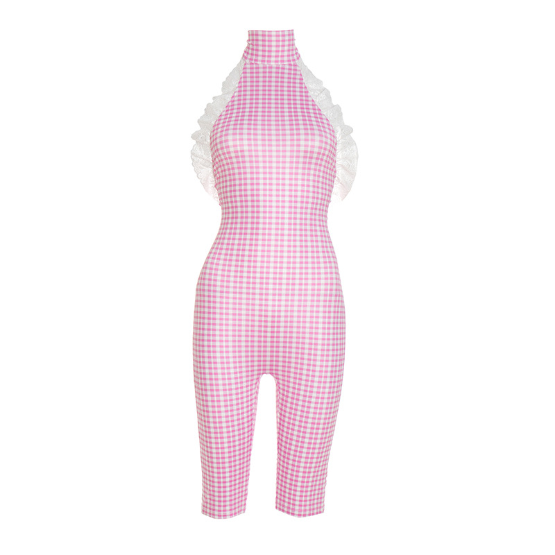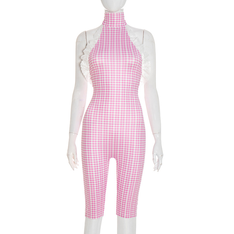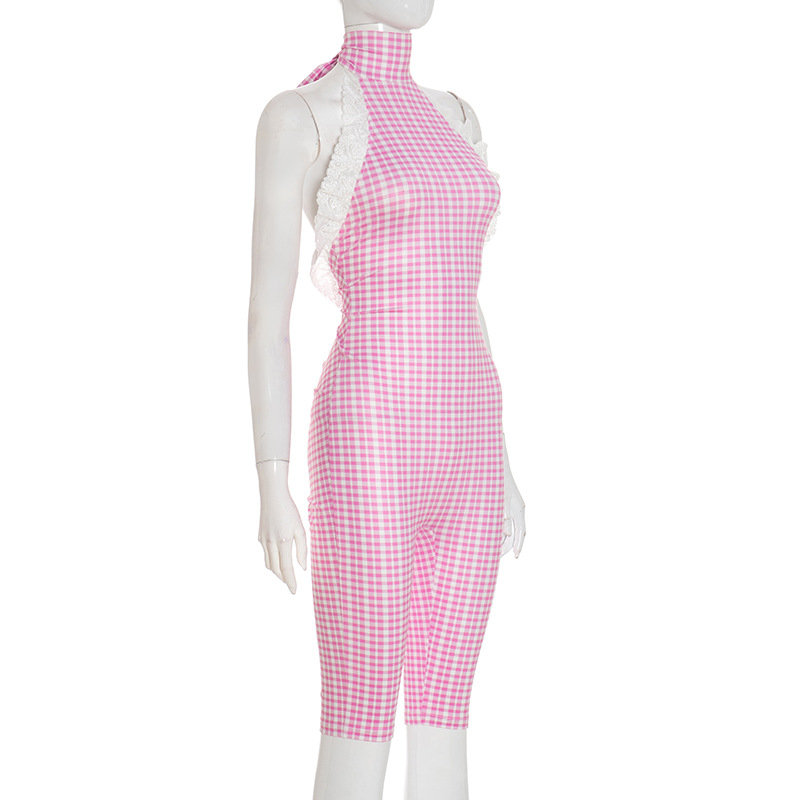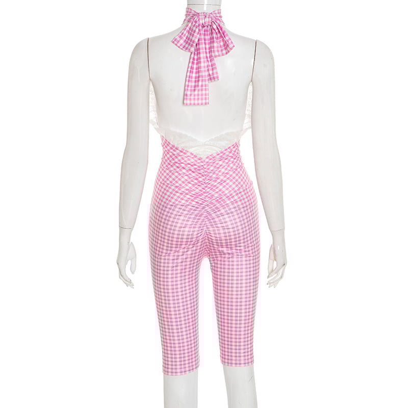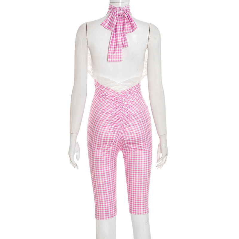 Retro style halterneck strappy backless lace plaid jumpsuit