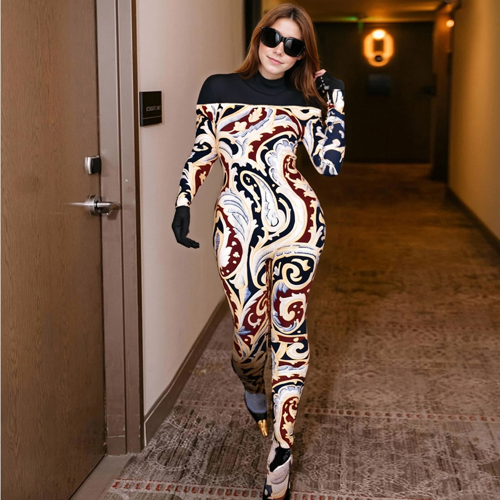 Sexy printed one-shoulder tube top long-sleeved slim-fit trousers jumpsuit