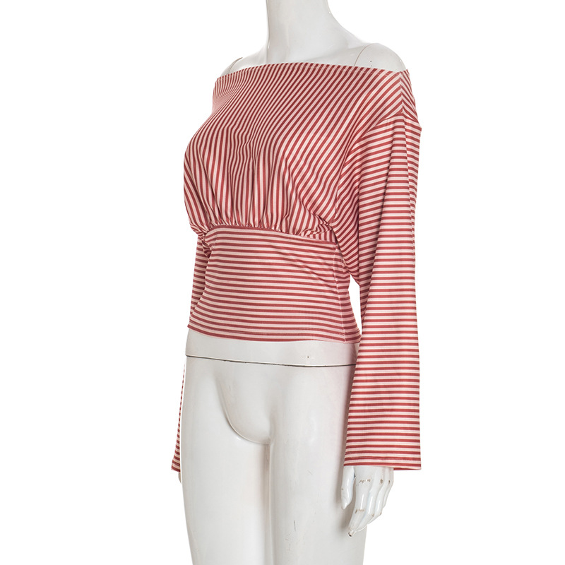 Striped off-the-shoulder loose-fitting long-sleeved top