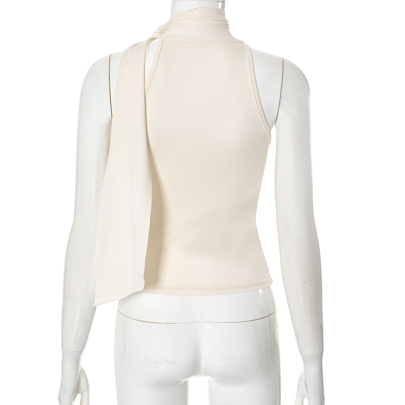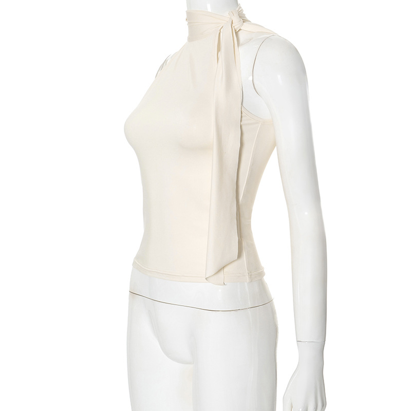 Solid color sleeveless high collar tied ribbon T-shirt top