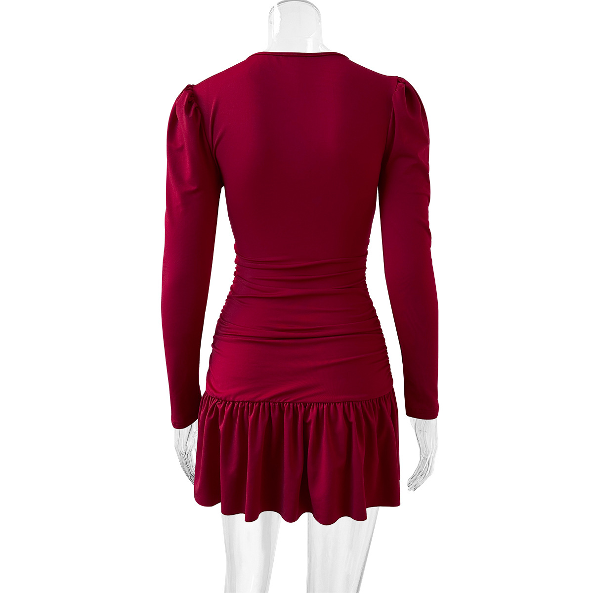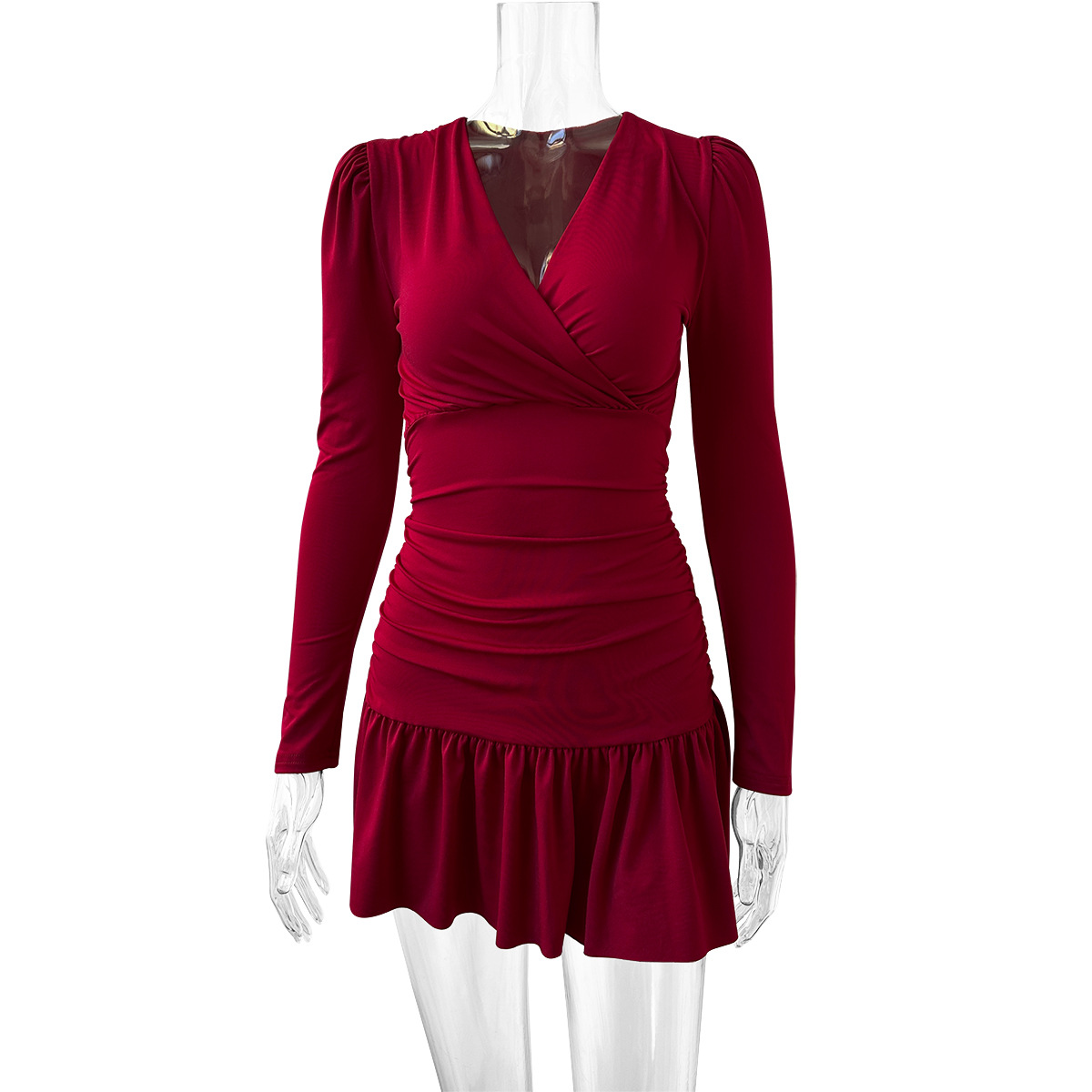 Sexy V-neck long-sleeved dress with pleated slim-fitting hip skirt