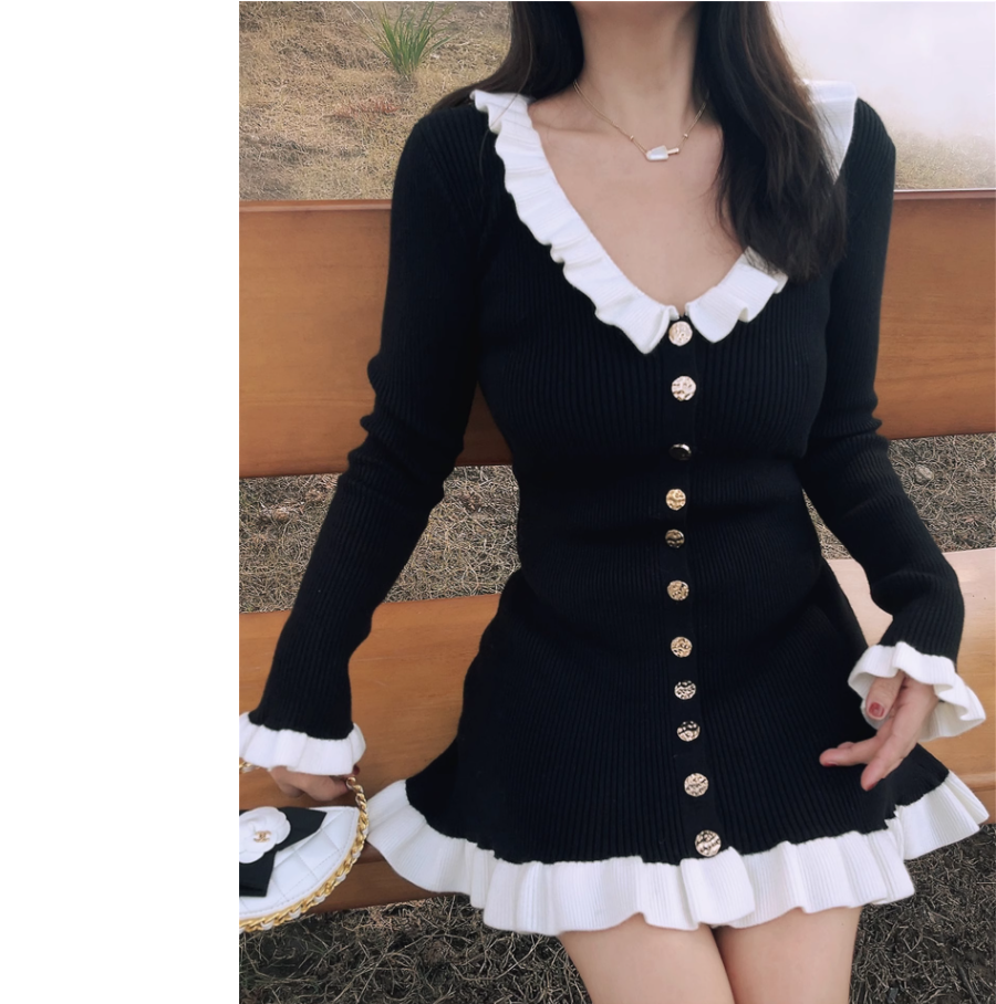 Black Hepburn style long-sleeved dress temperament hip skirt