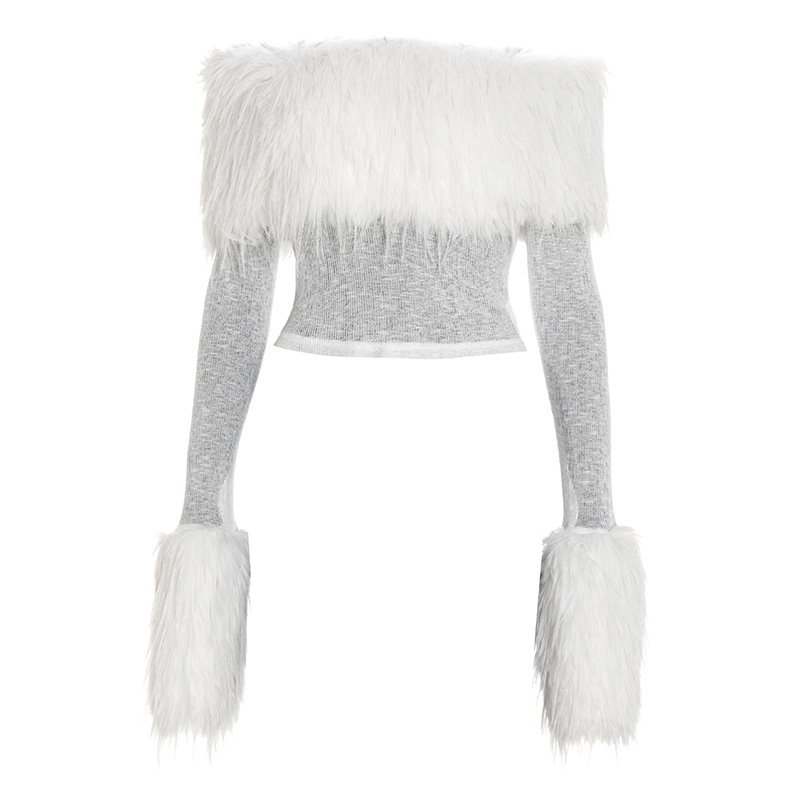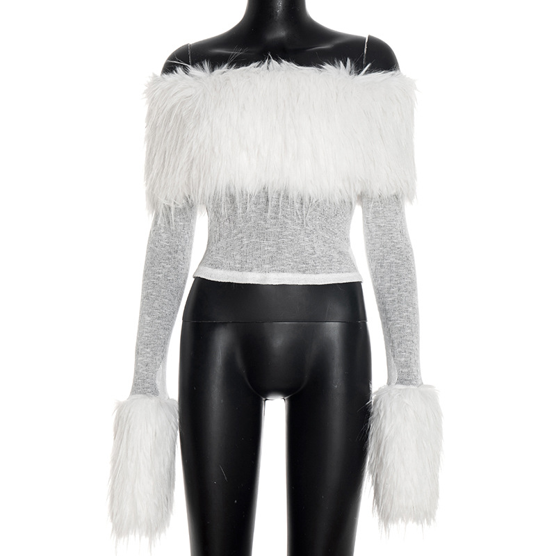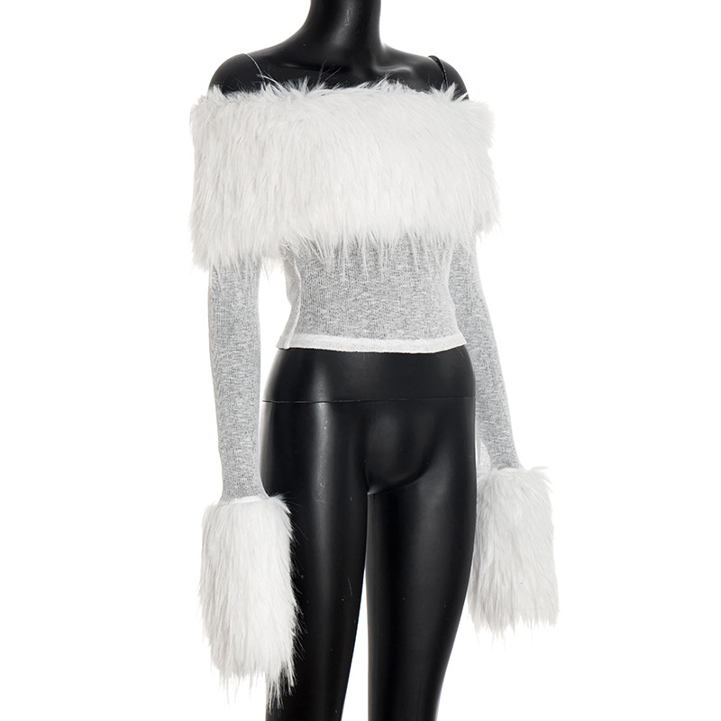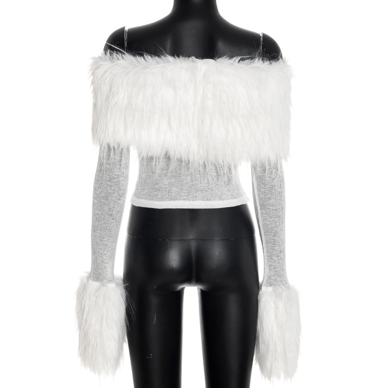 Sexy hottie style solid color short fur patchwork long-sleeved top