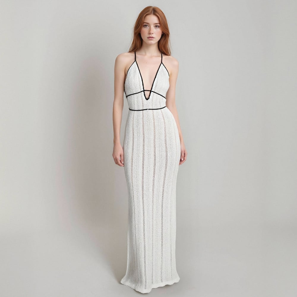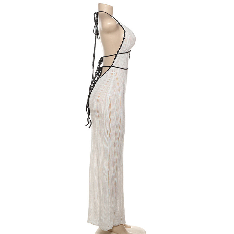 Fashionable contrast color V-neck halter neck lace-up backless knitted dress