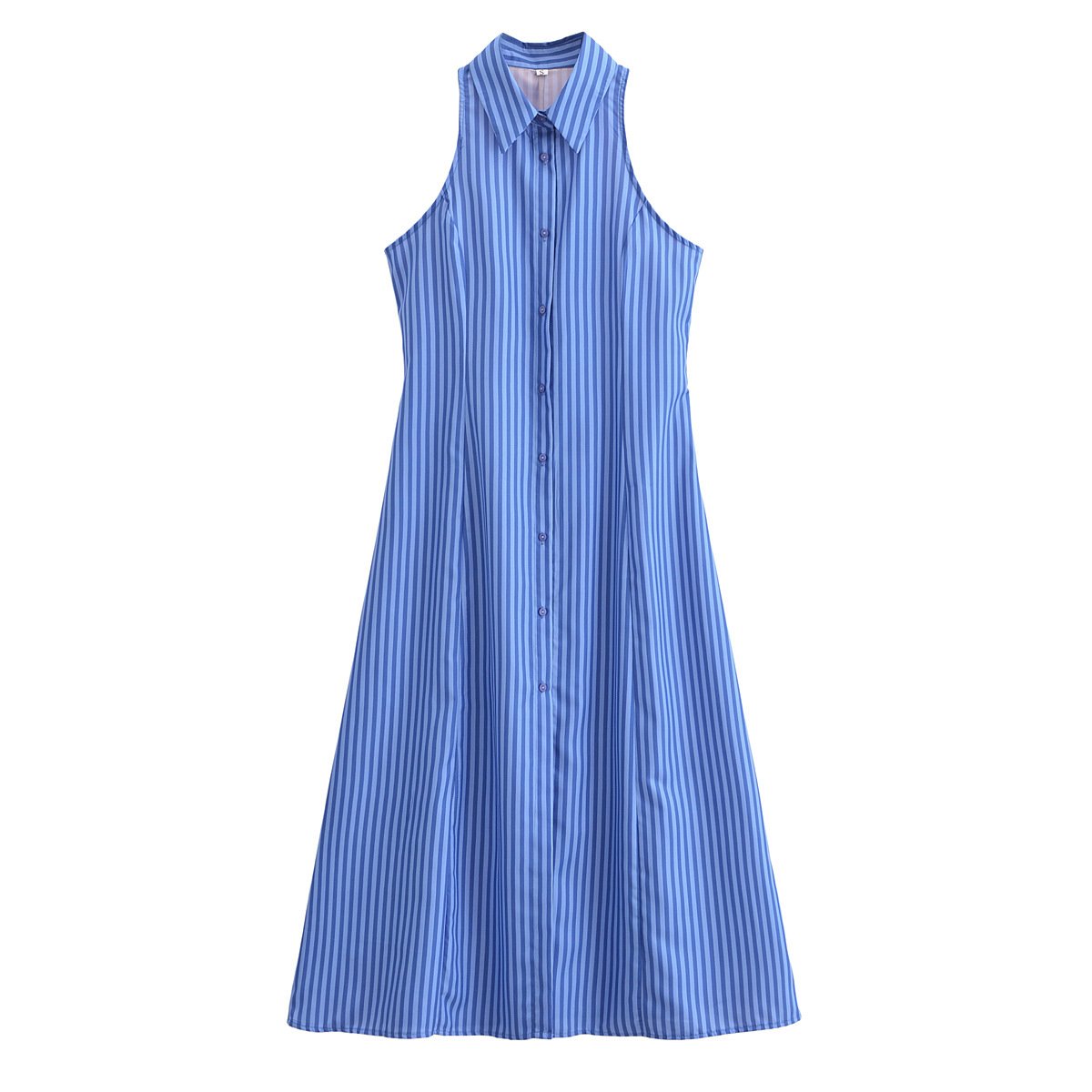 Striped lapel single-breasted sleeveless tie-down maxi dress