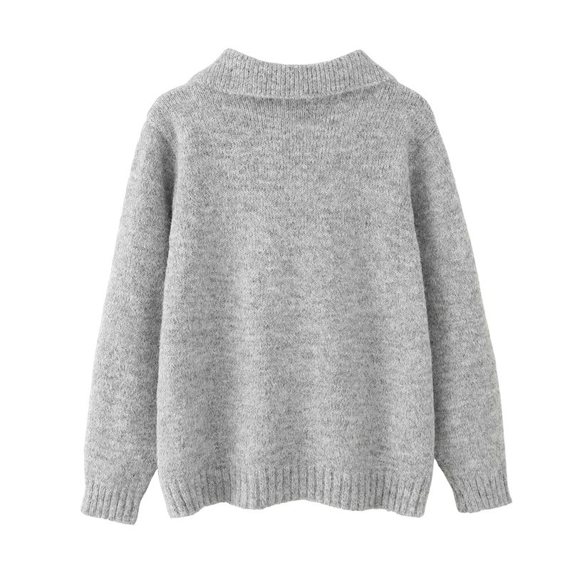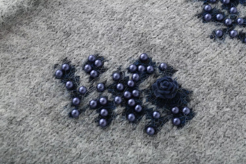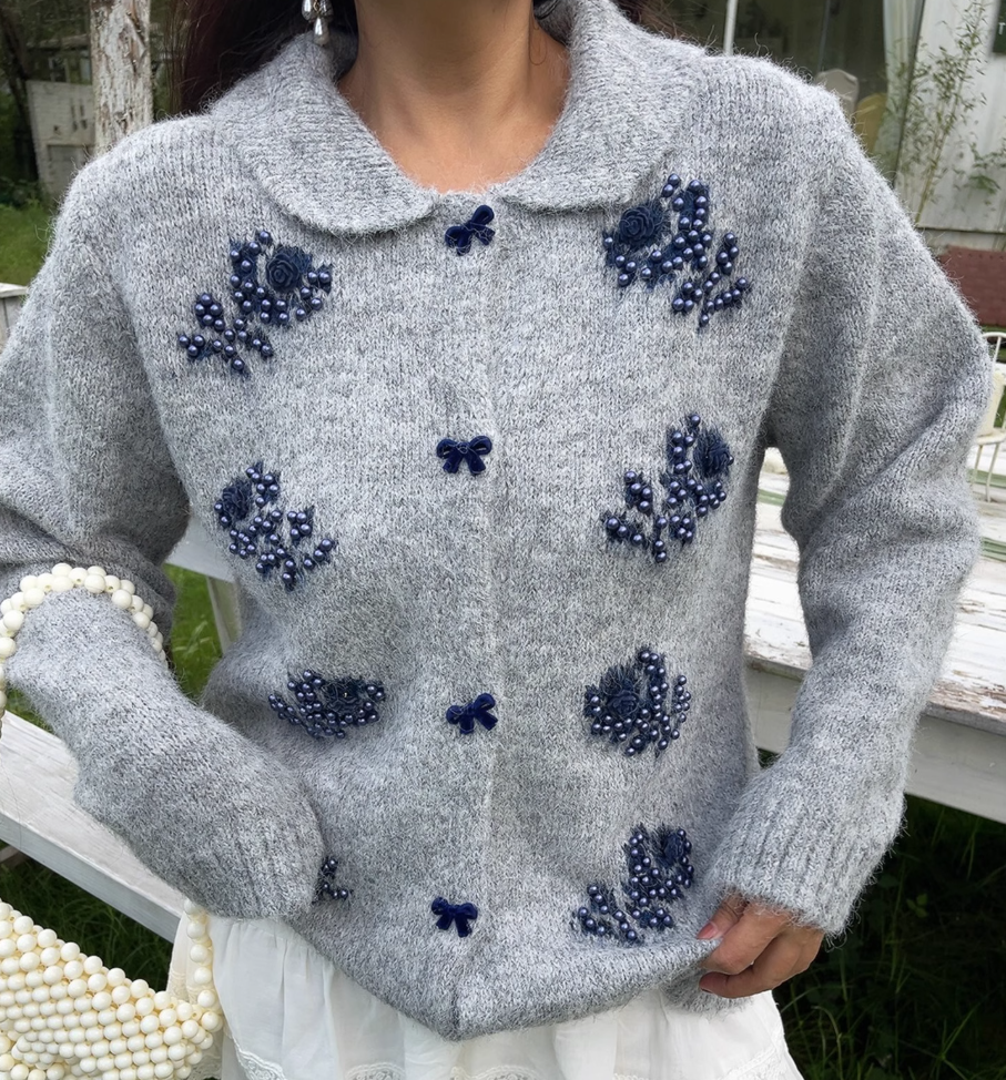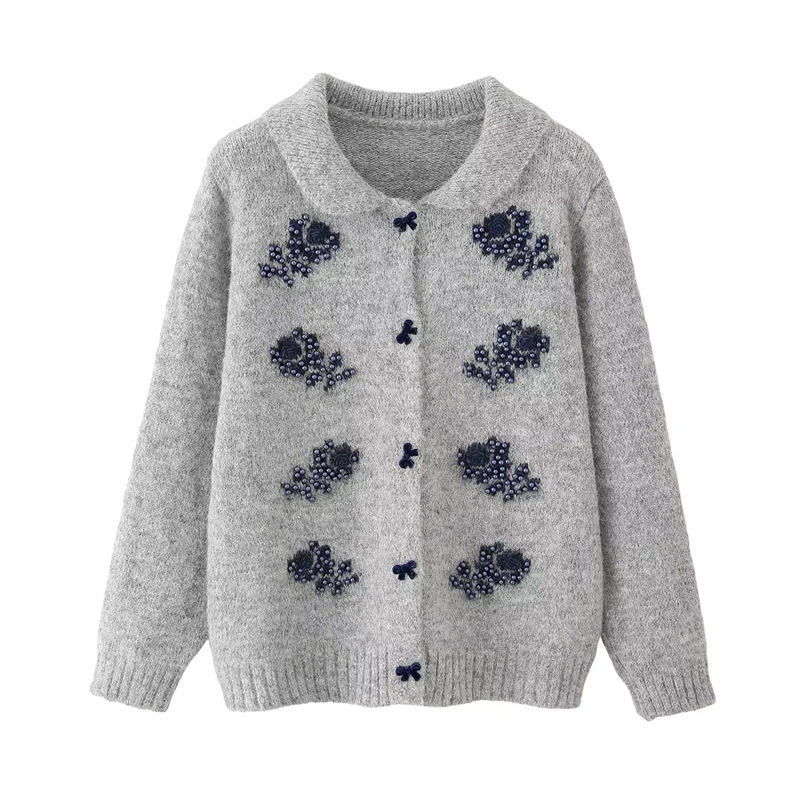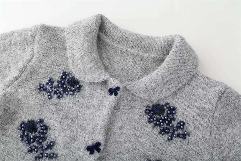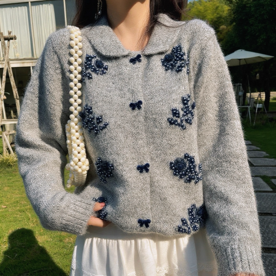 Sweet beaded chic butterfly button loose sweater retro lapel long-sleeved knitted cardigan