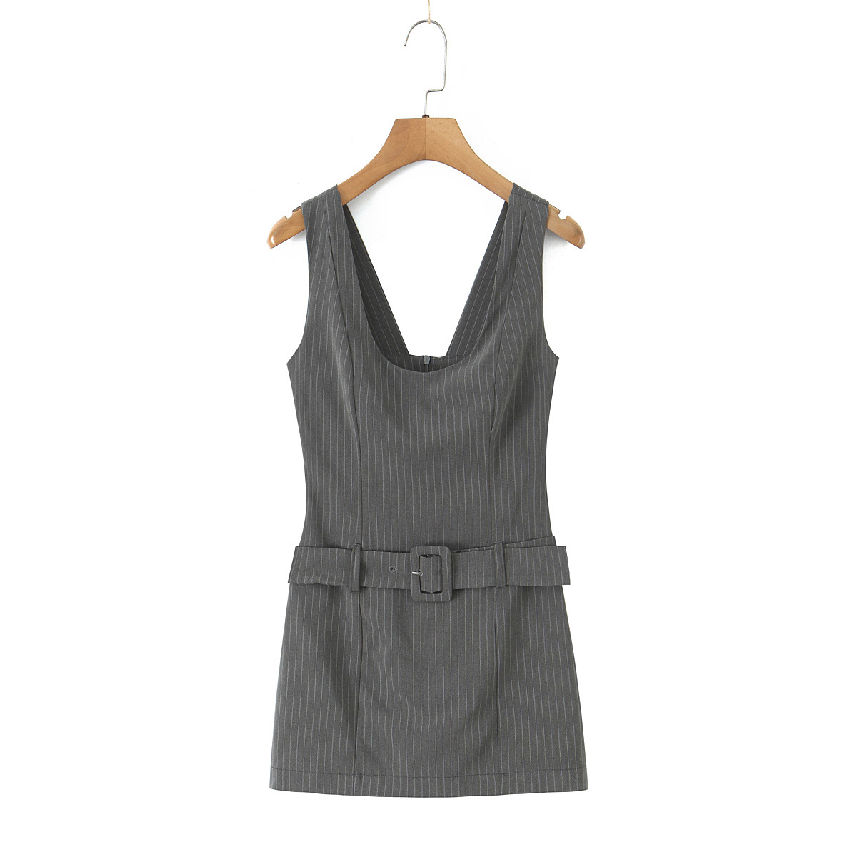 Fashion retro striped belt jumpsuit skirt with belt short dress