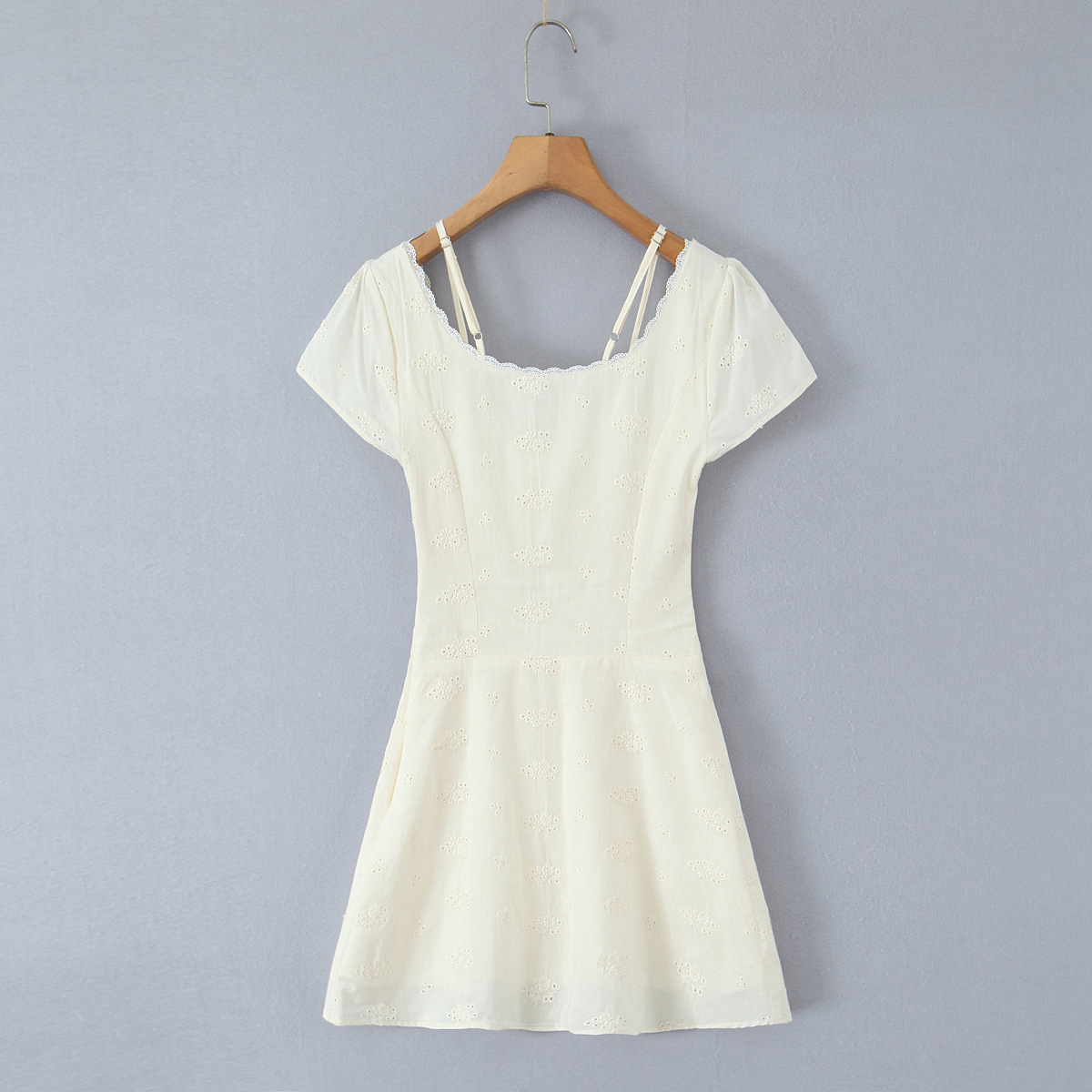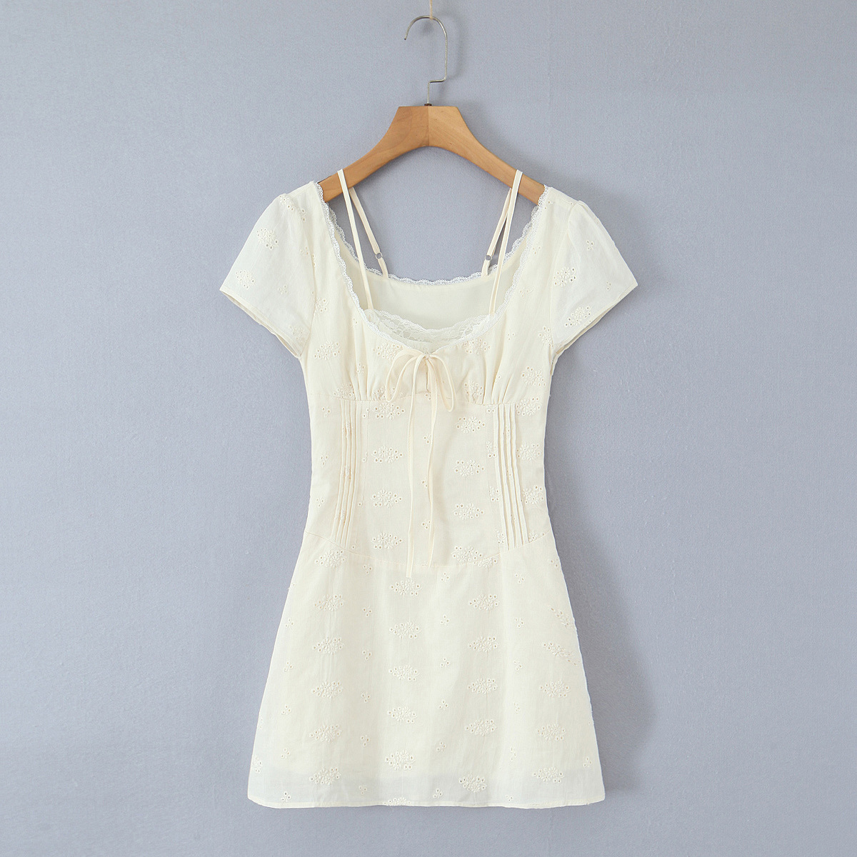 Lace-trimmed pleated puff sleeve short waist slimming skirt dress