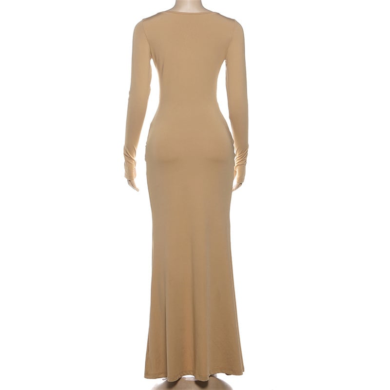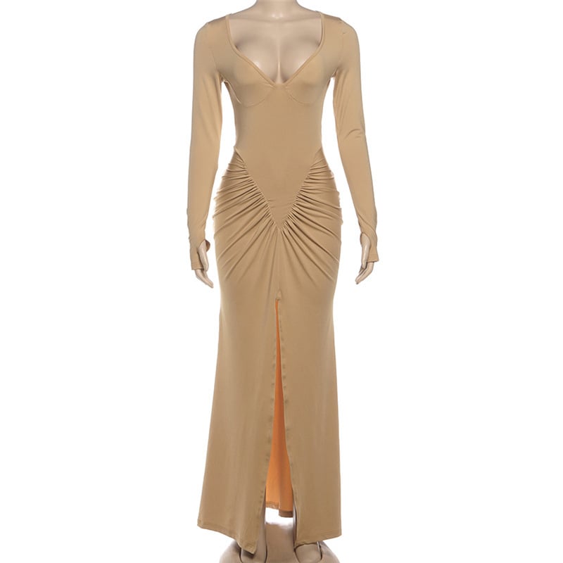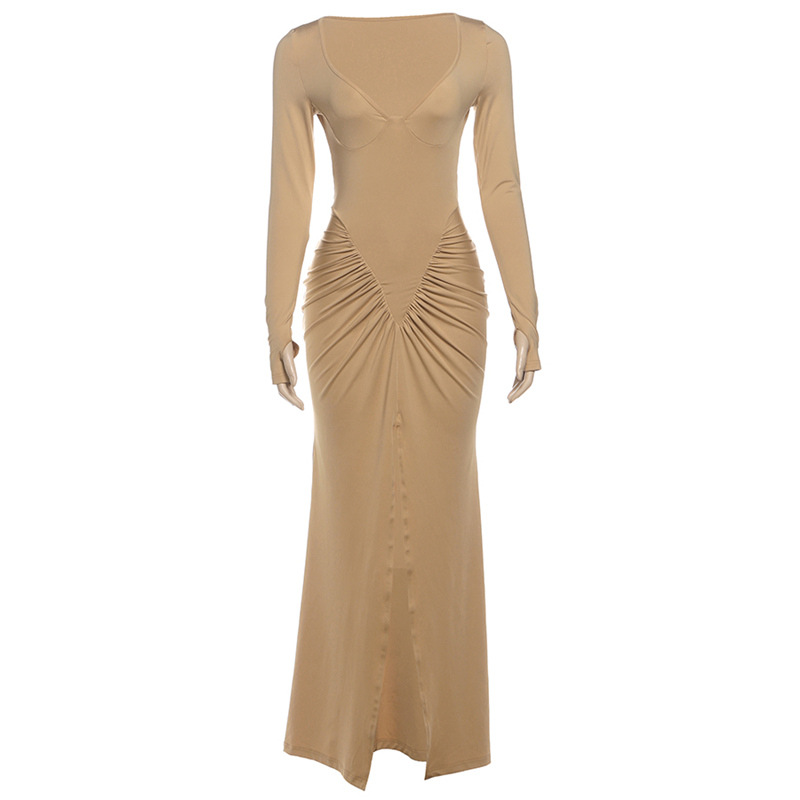 Stylish solid color sexy slim-fit bodycon pleated slit dress