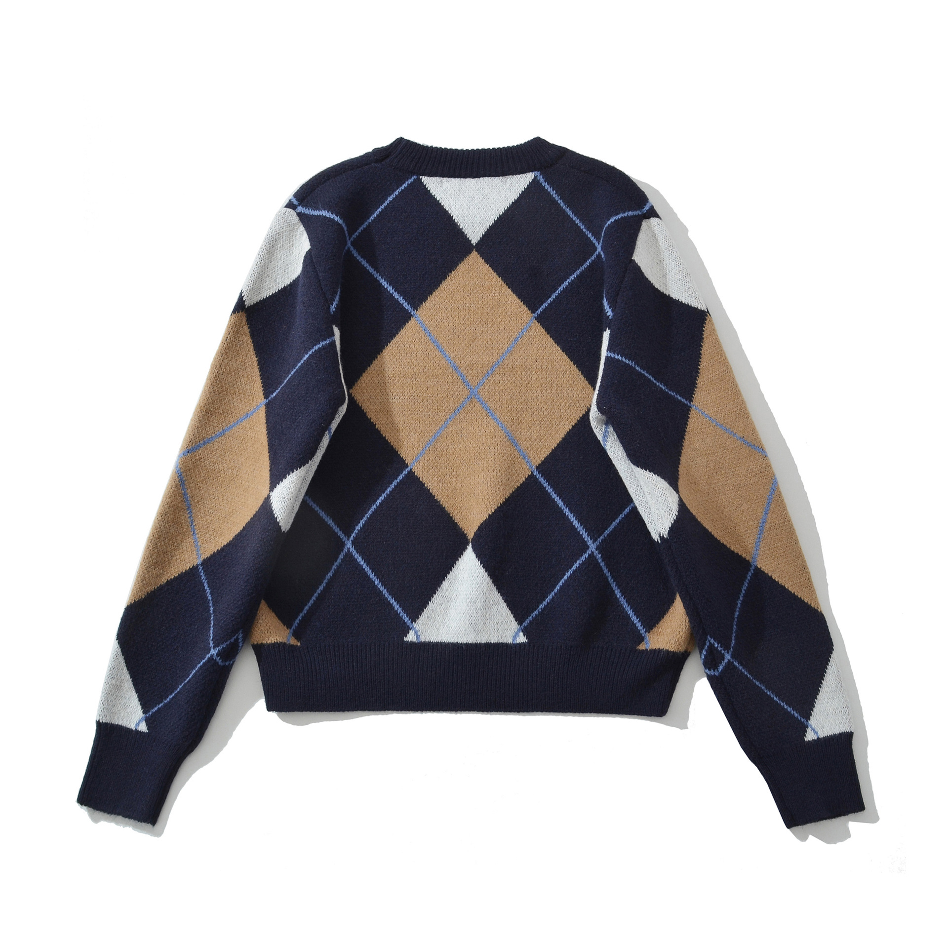 Retro-style round neck long-sleeved loose-fitting diamond pattern pullover sweater