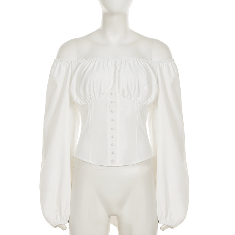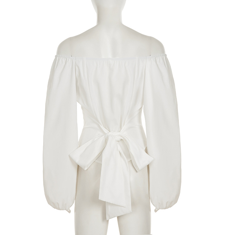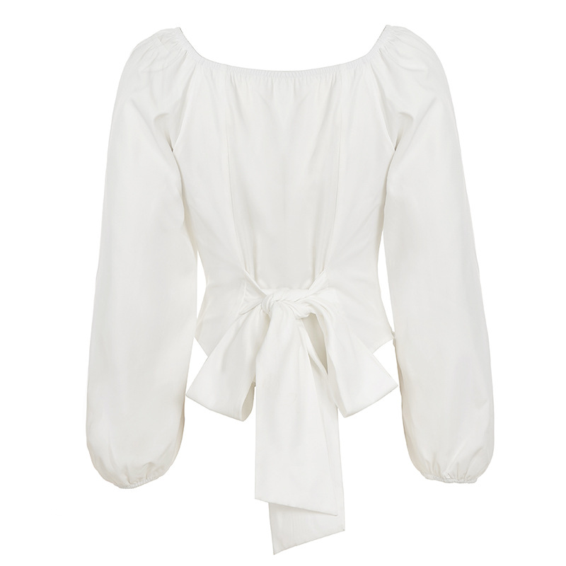 Off-the-shoulder puff sleeve shirt with a fitted waist and tie, solid color top