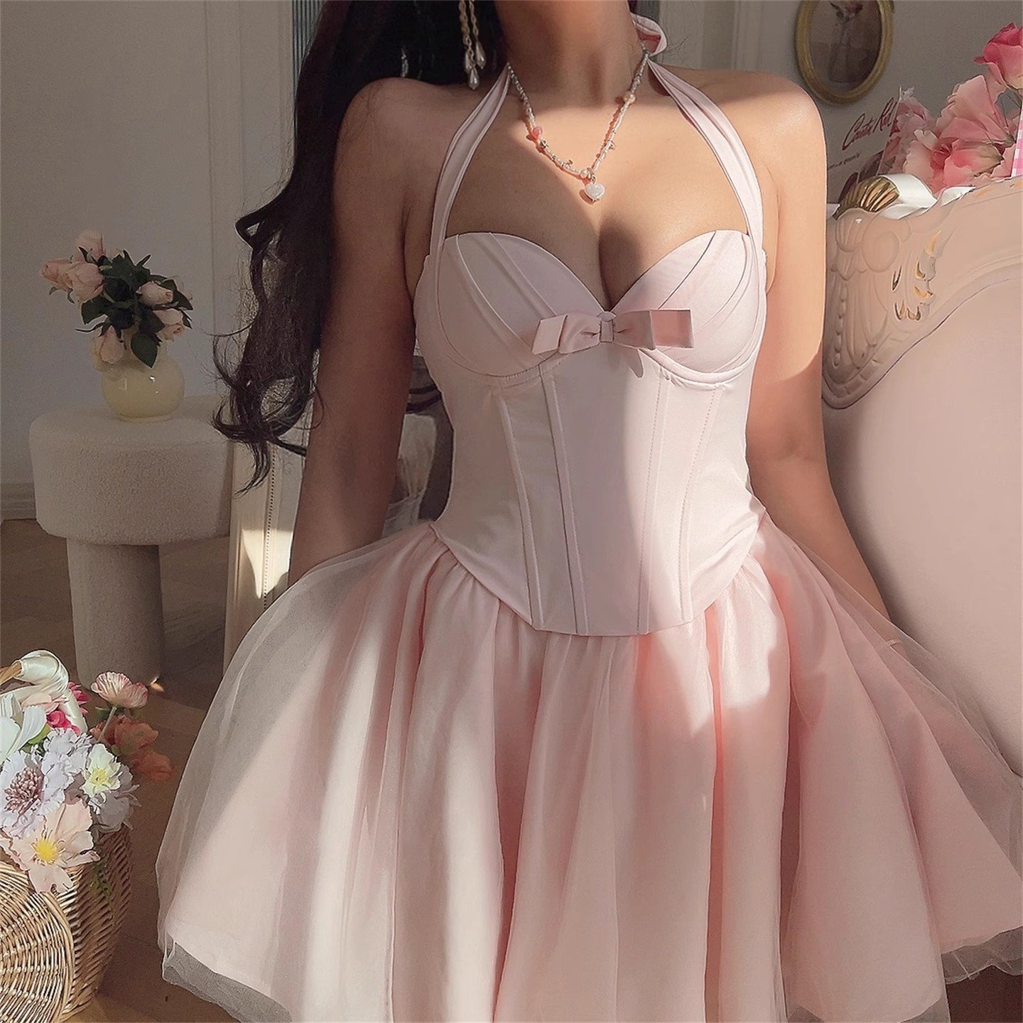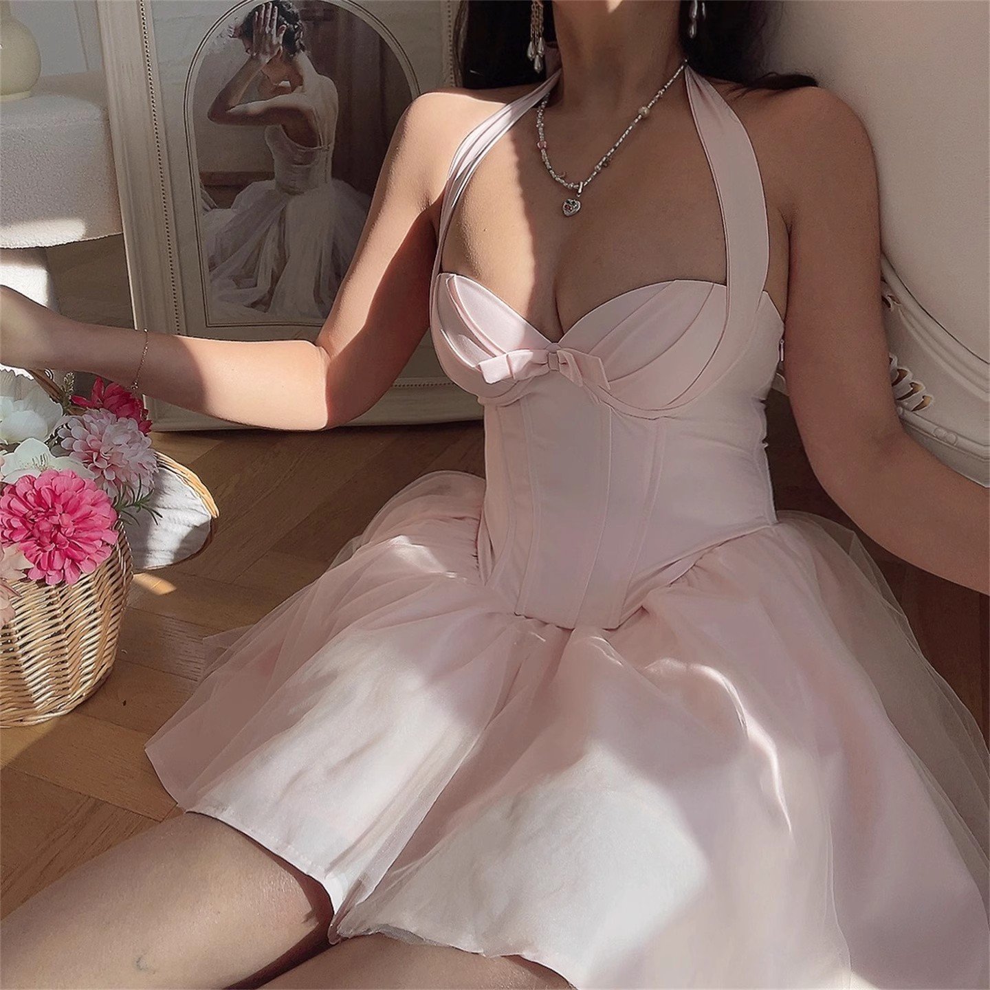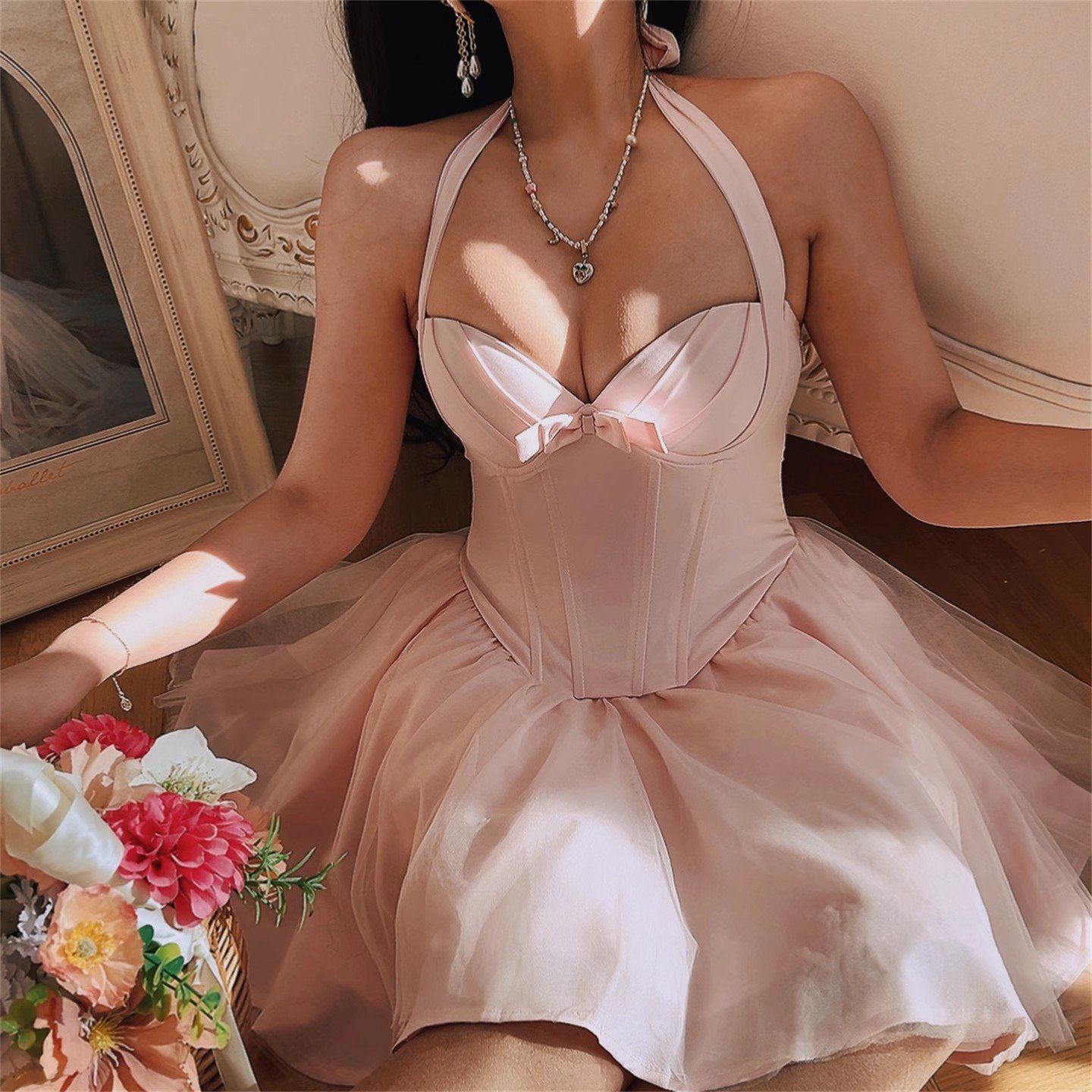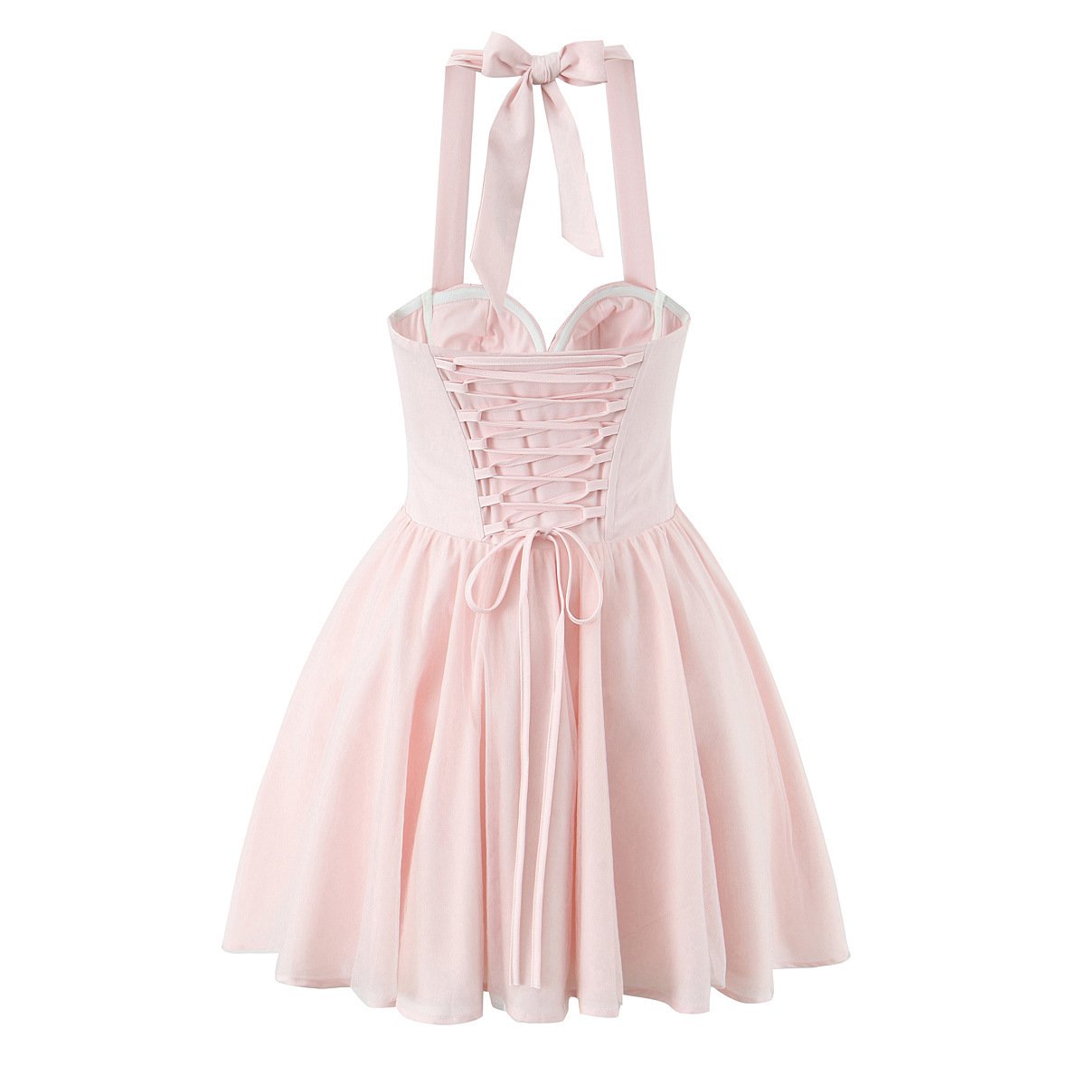 Herringbone steel halter neck mesh camisole dress
