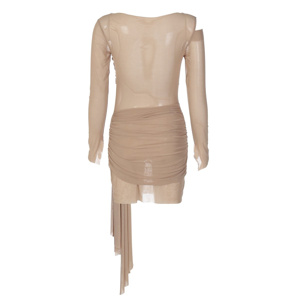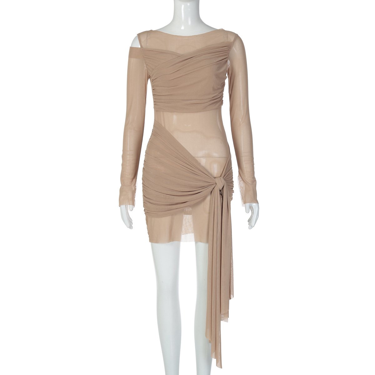 Sexy mesh-paneled long-sleeved slim-fitting bodycon dress with tie-up details