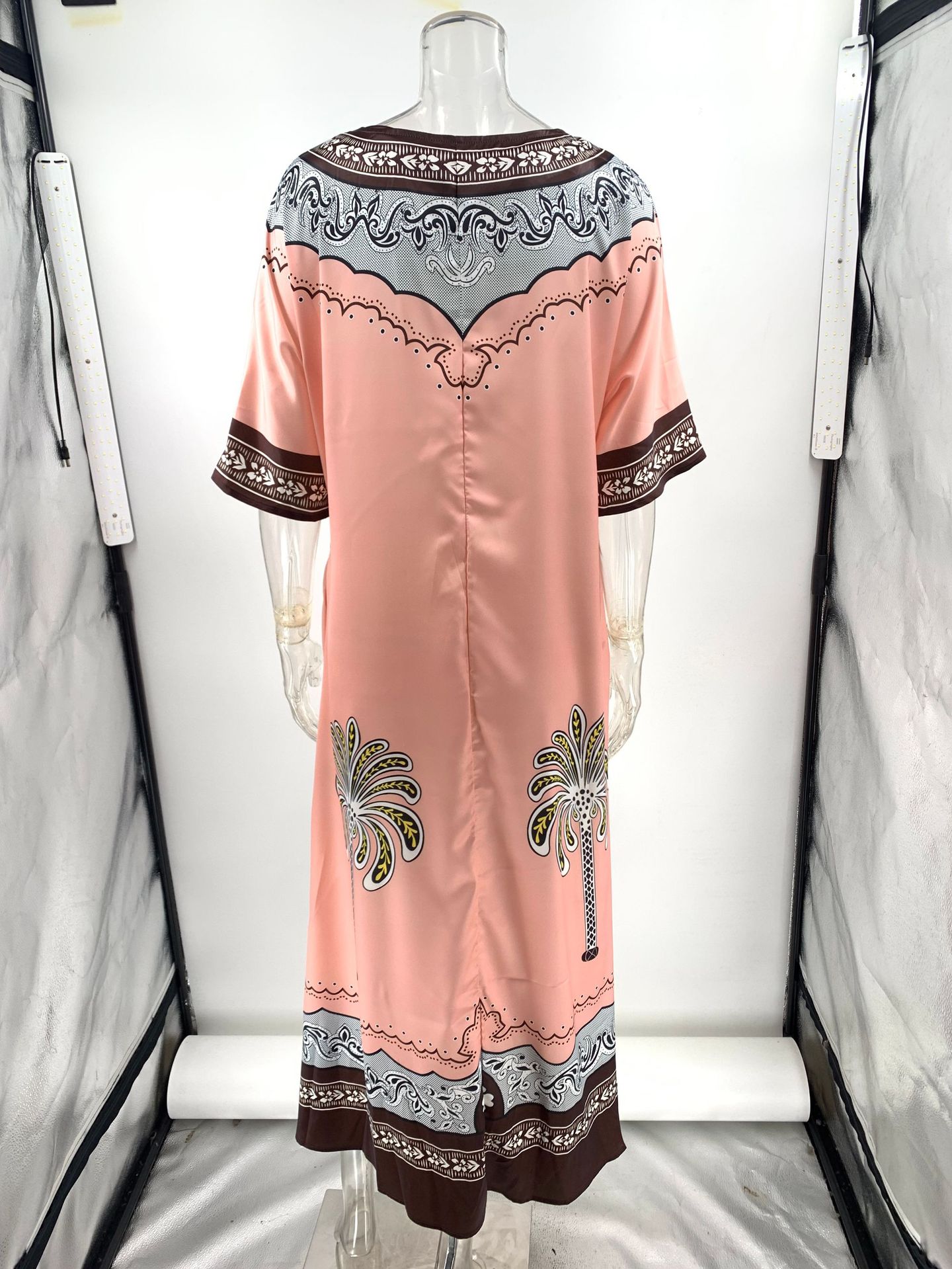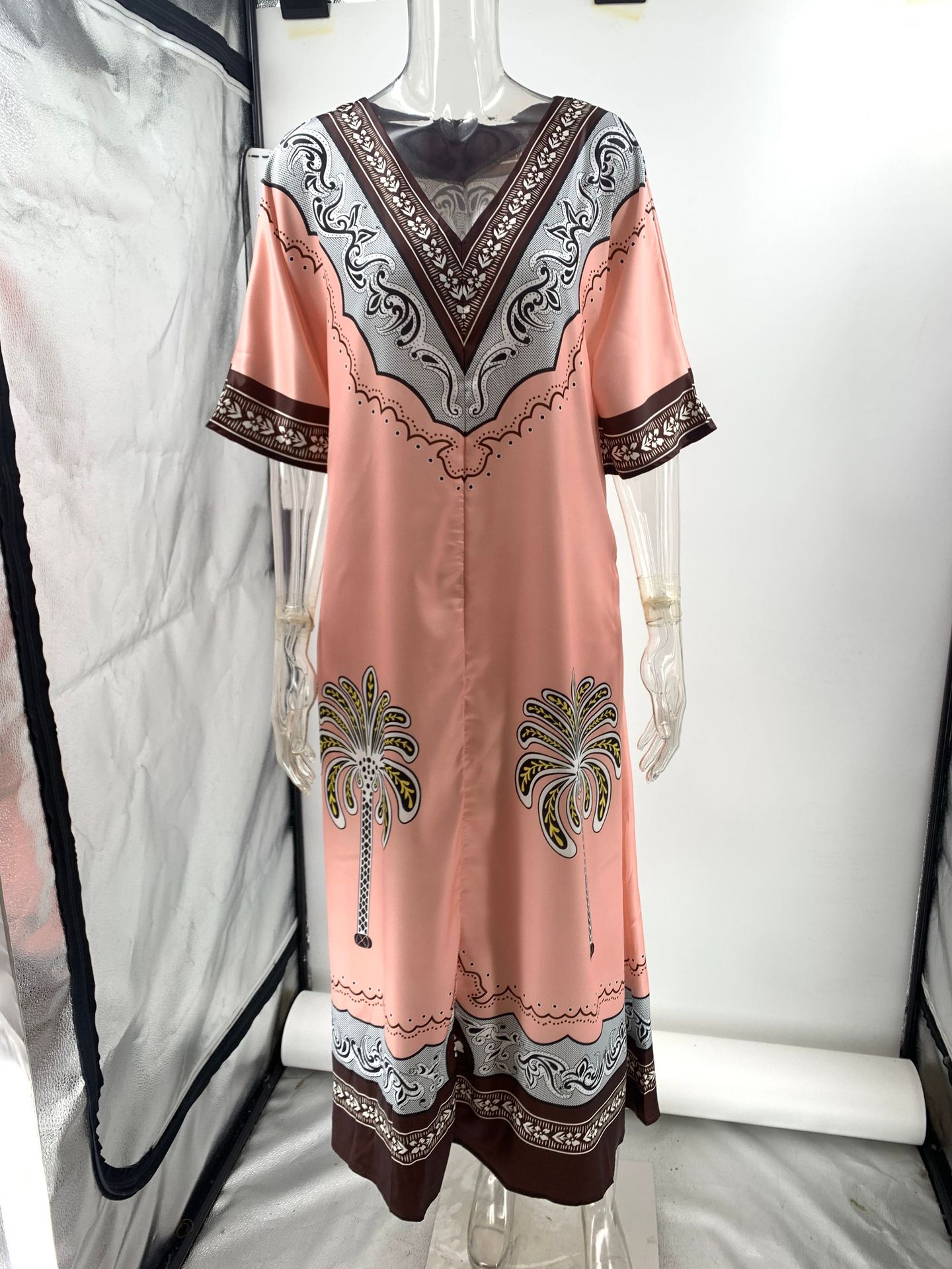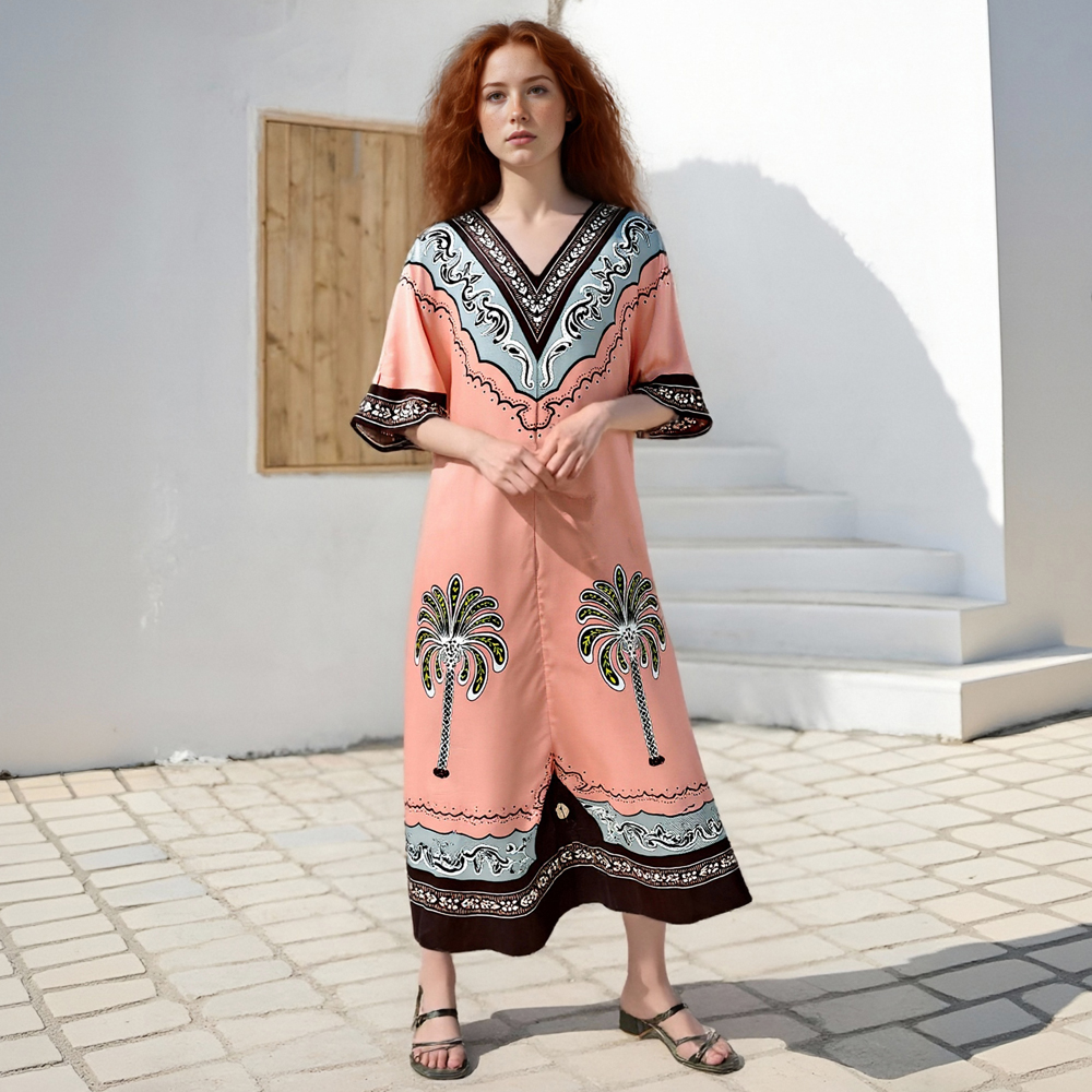 Casual style printed V-neck loose-fitting satin resort dress