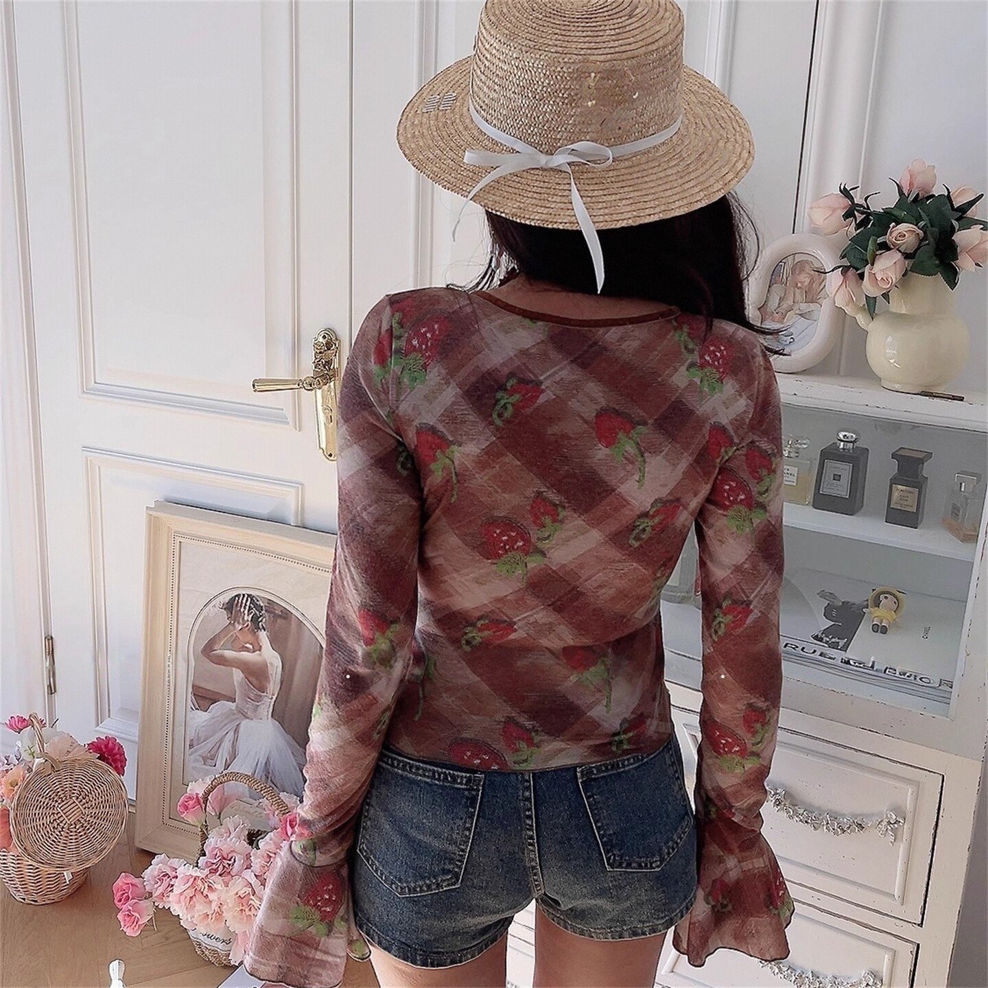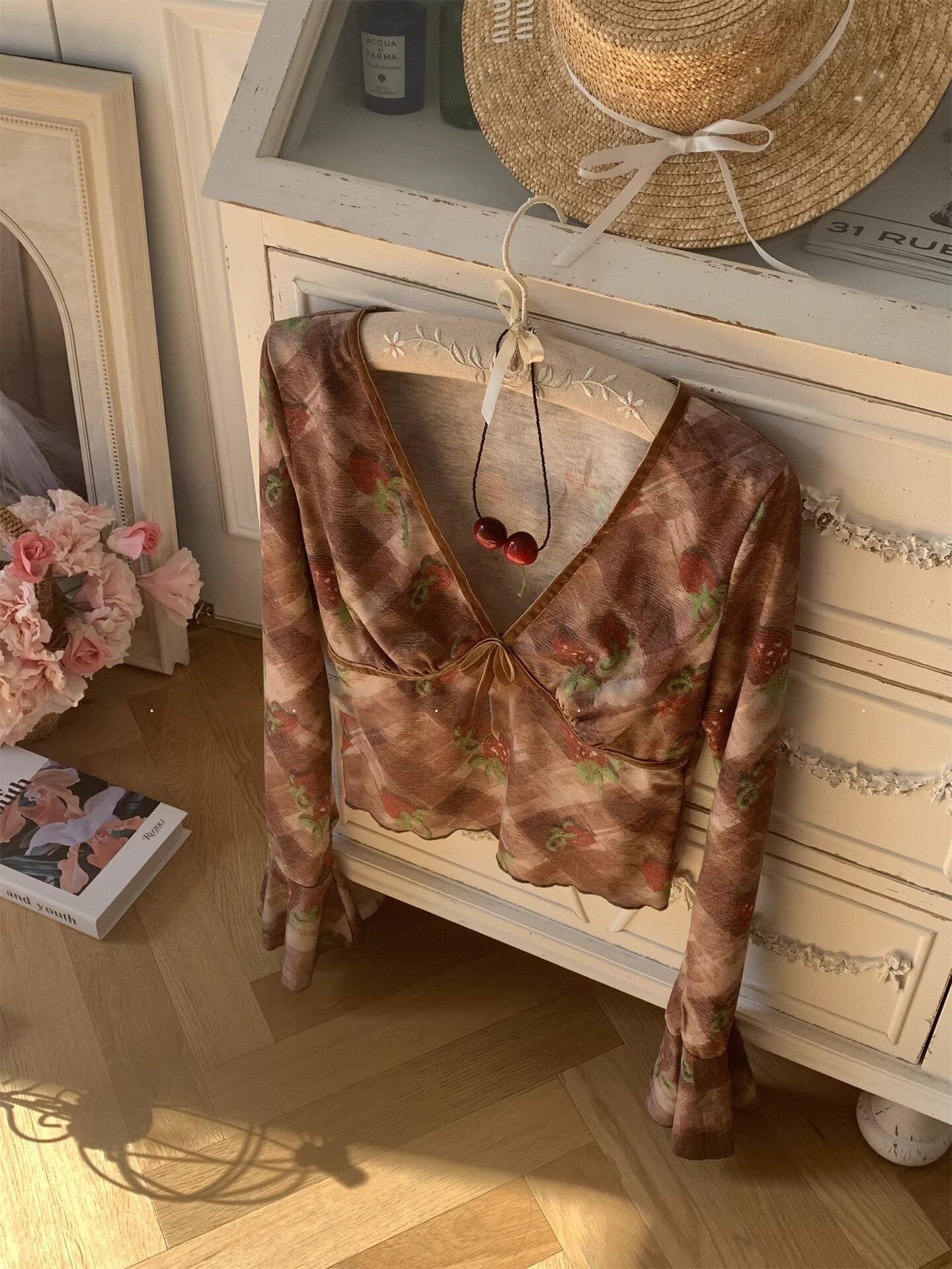 Deep V-neck blouse with bow detail and flared sleeves (a trendy and alluring style)