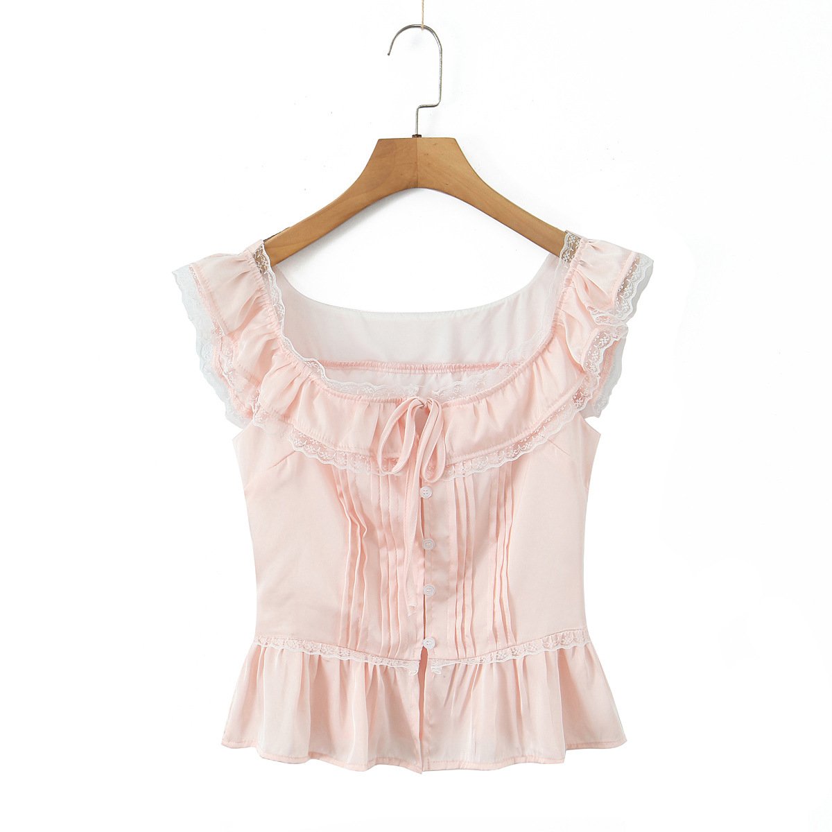 Deep U-neck lace-trimmed spaghetti strap tank top
