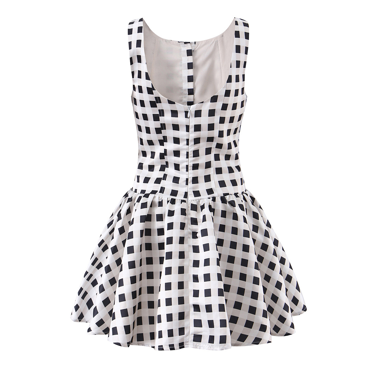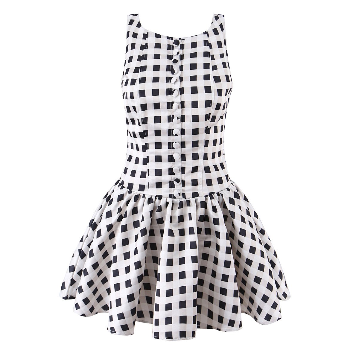 Round-neck, single-breasted, pull-on plaid dress with an open back and mini-length skirt.