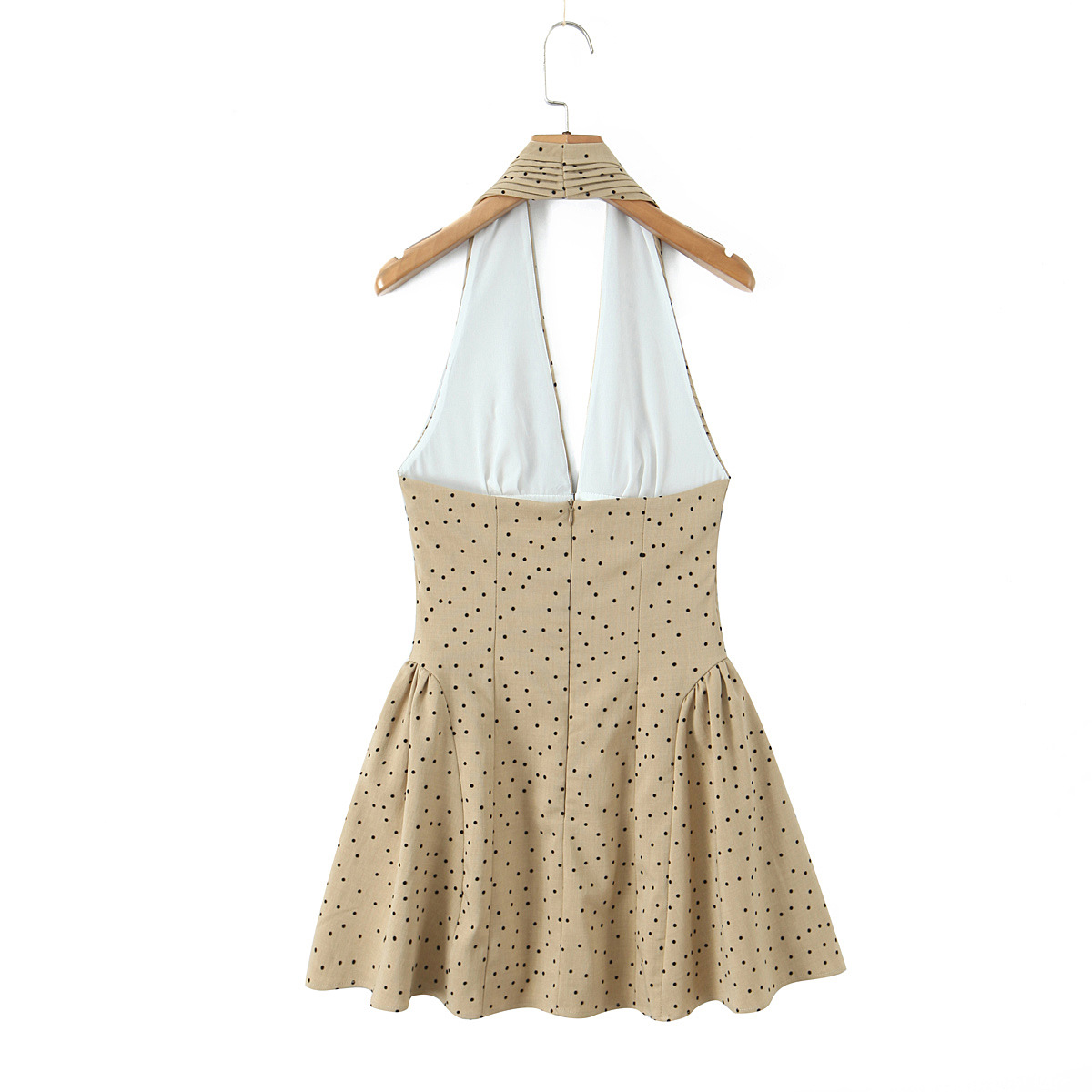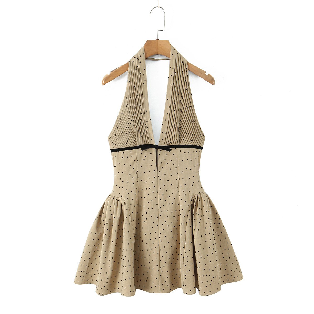Sexy and elegant polka dot V-neck pleated halter neck backless dress.