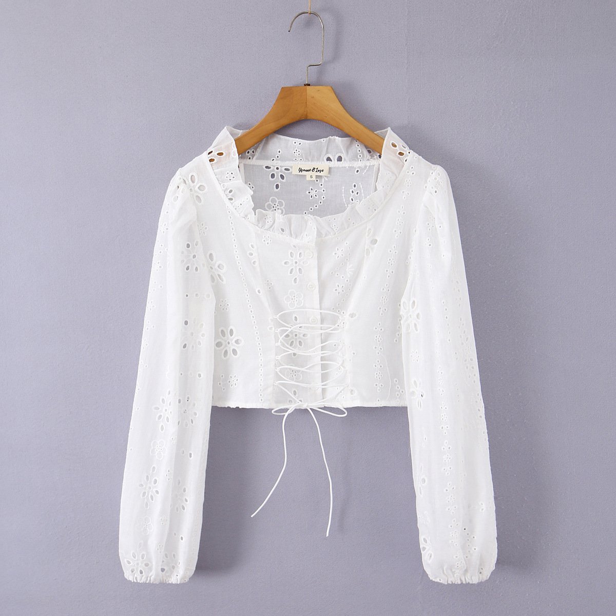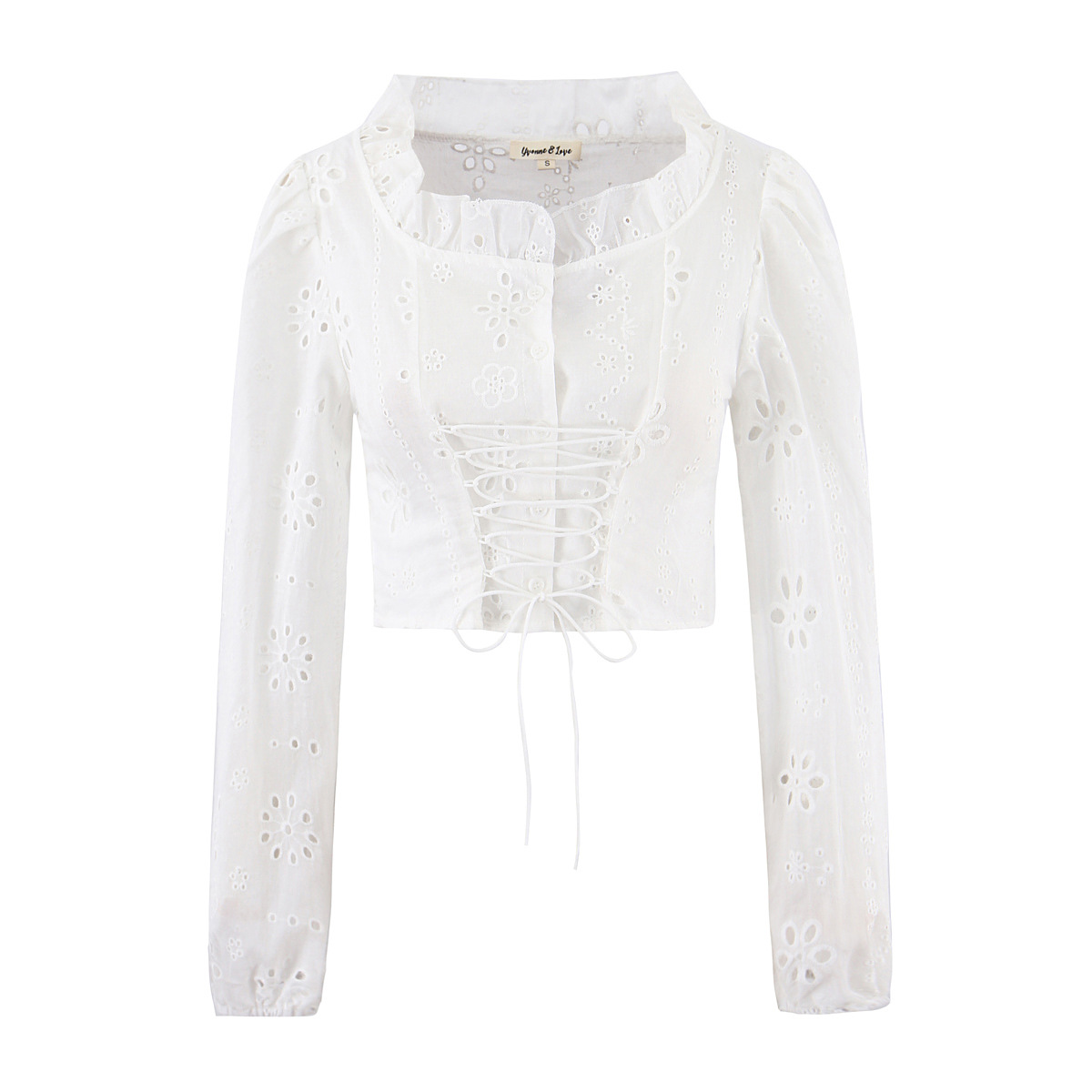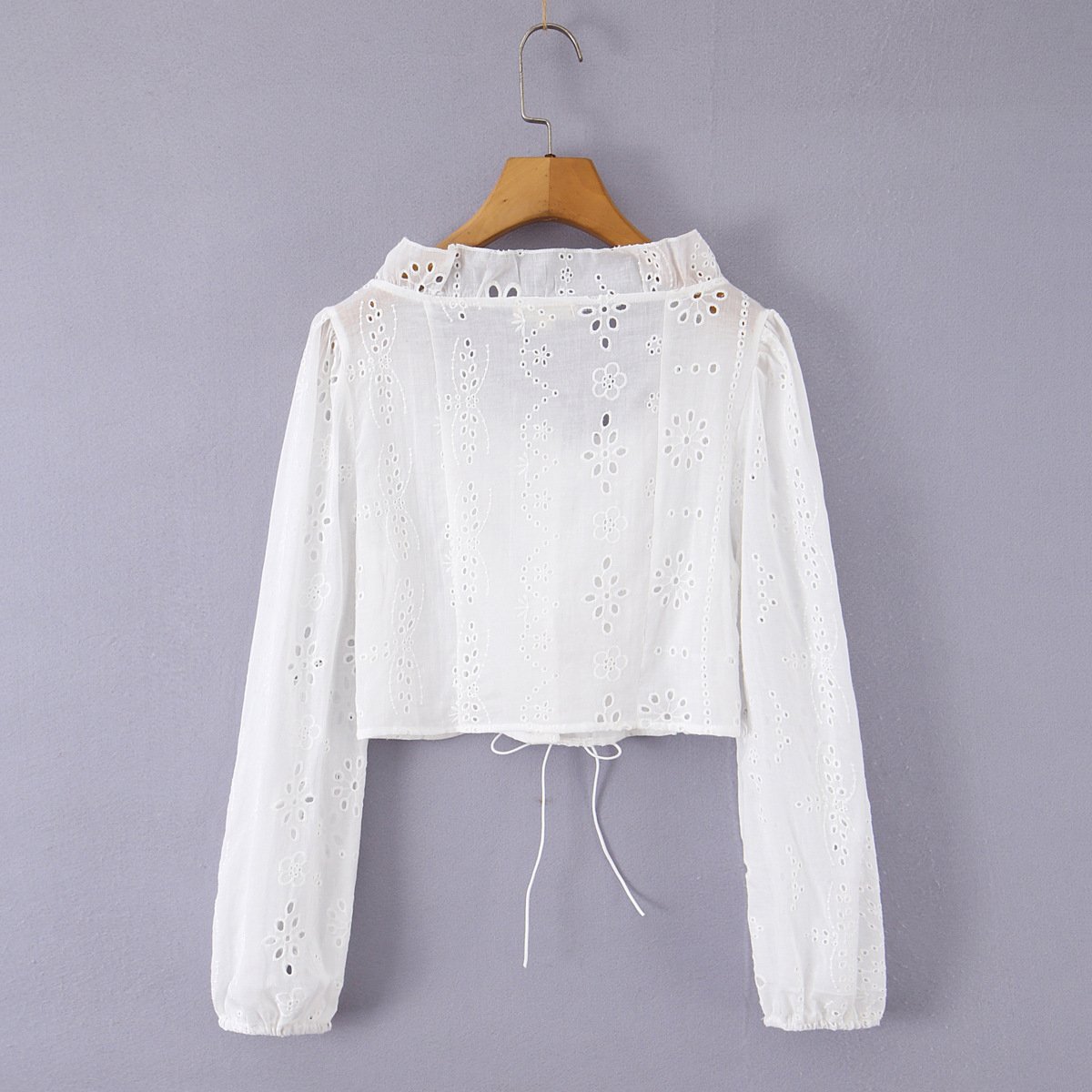 Hollow-out embroidered lace-up ruffled lantern sleeve cropped white shirt
