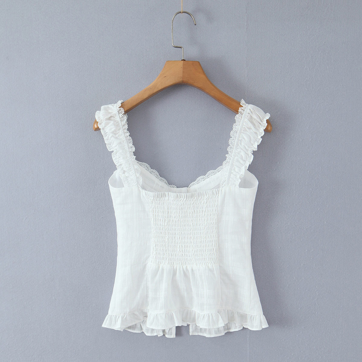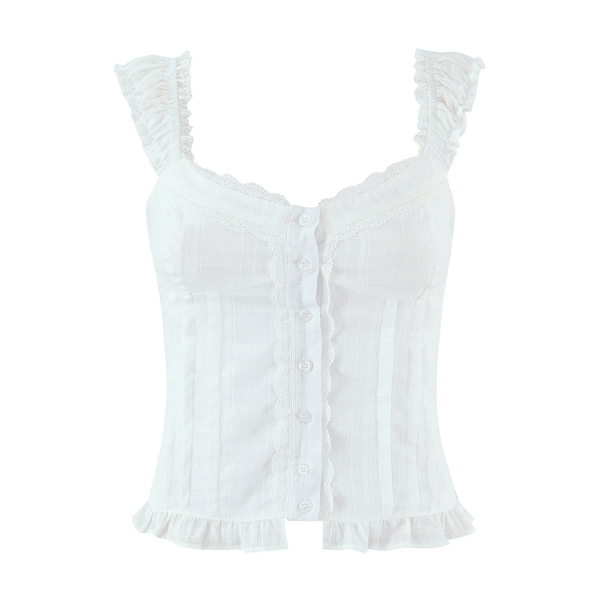 White fitted top with lace trim, elasticated back, and ruffled details.