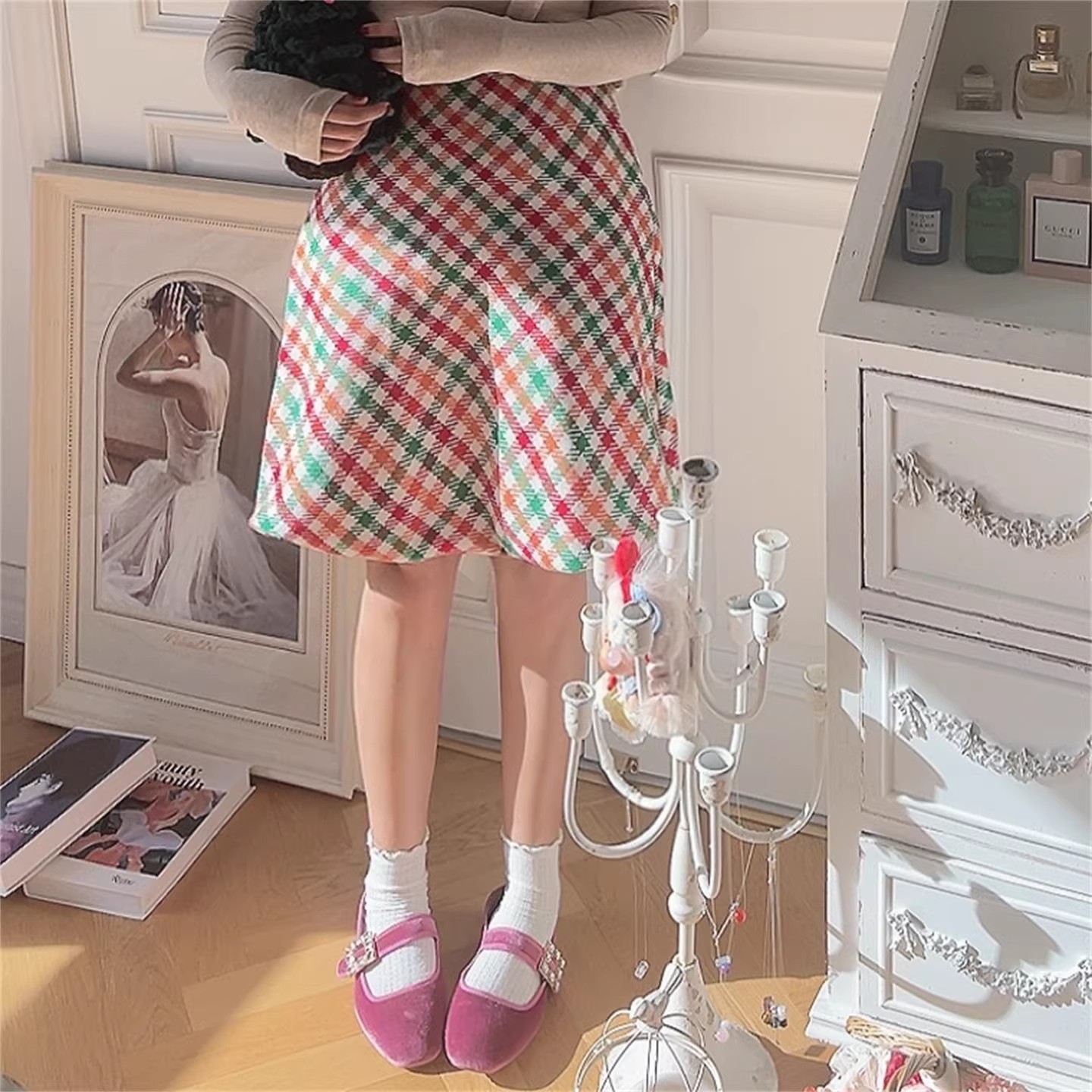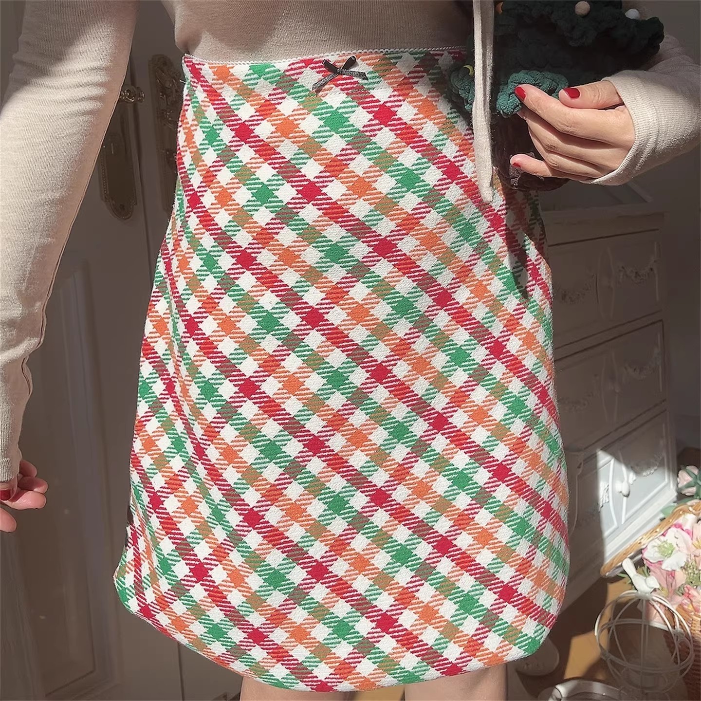 Retro high-waisted A-line skirt with colorful checkered pattern.