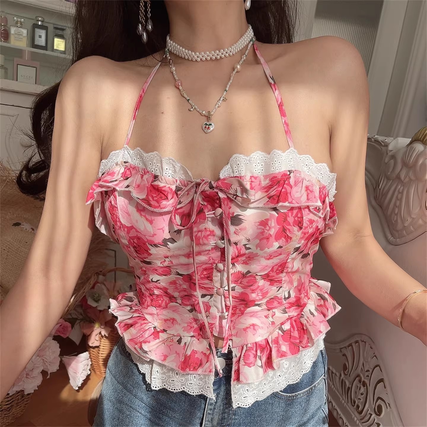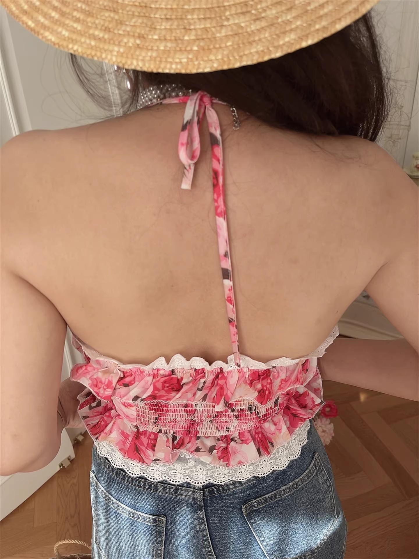 V-neck, halter-neck top with tie closure, floral print, and ruffle details.